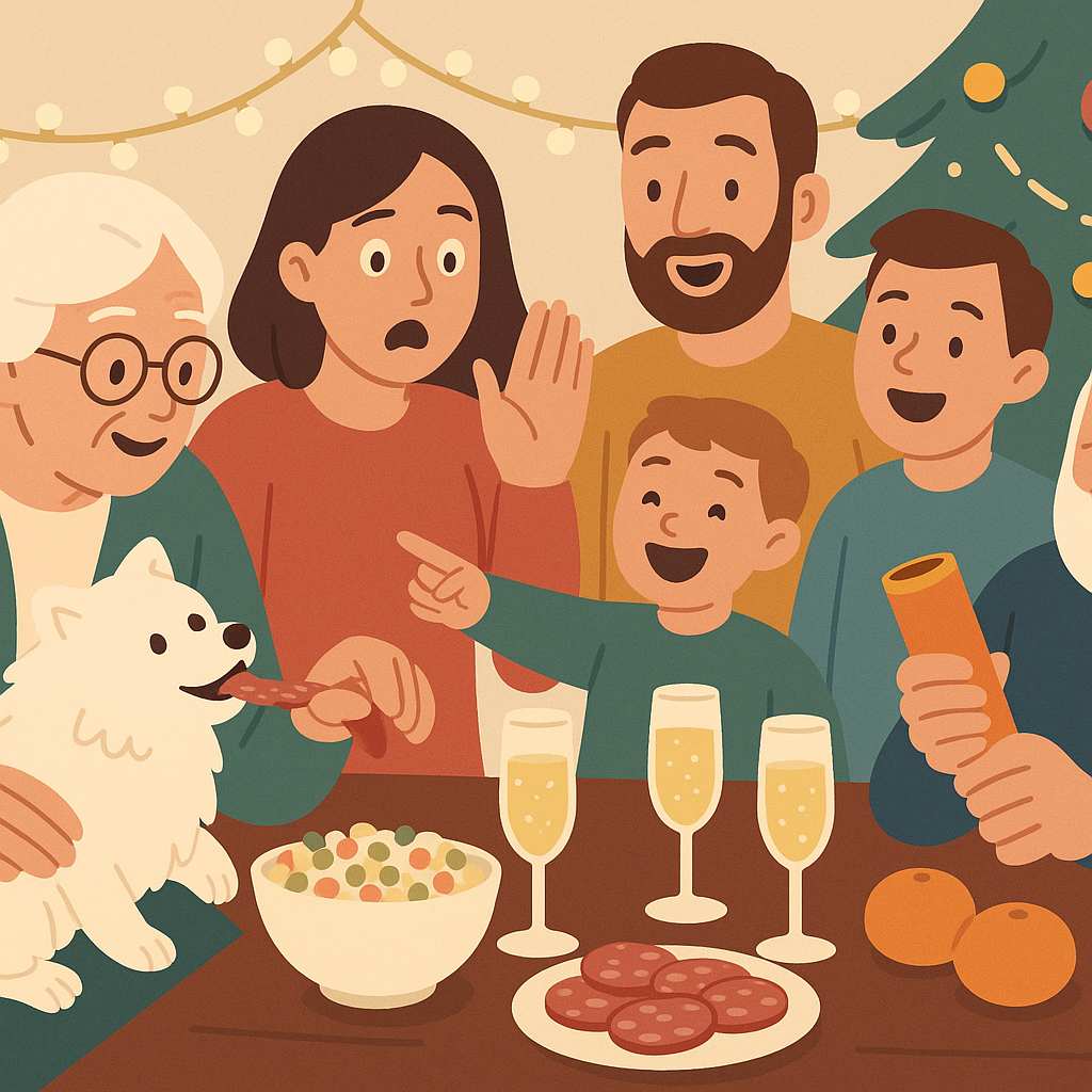 Новый год подкрадывается — мандарины шепчут, «Оливье» уже занимает пол холодильника, бабушка точит нож на колбасу. Но для собак это время повышенной опасности: не фейерверки страшнее всего, а стол, полный соблазнов, и родные, которые искренне уверены, что «собачке тоже можно». Колбасы для пушистиков слишком жирные и солёные, салаты с майонезом — тоже. Отравления под праздники встречаются часто, а в некоторых городах ветеринары в эти дни работают по сокращённому графику.