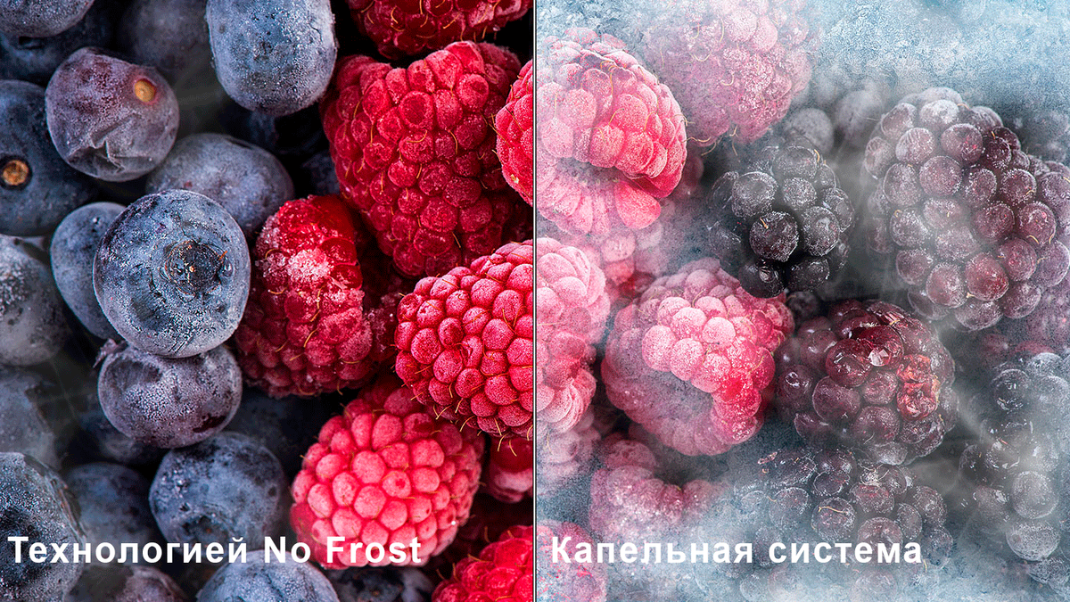 Эта система работает только в одной из камер двухкамерного холодильника. Чаще всего функция заморозки “без инея” располагается в морозильной камере, а в холодильной используется капельная система разморозки. По этому не стоит пугаться капель на задней стенки холодильной камеры, т.к. это является нормой для двухкамерных холодильников с технологией Frost Free. Циркуляция холодного воздуха есть лишь в морозильной камере, которая обеспечивается за счет вентилятора.