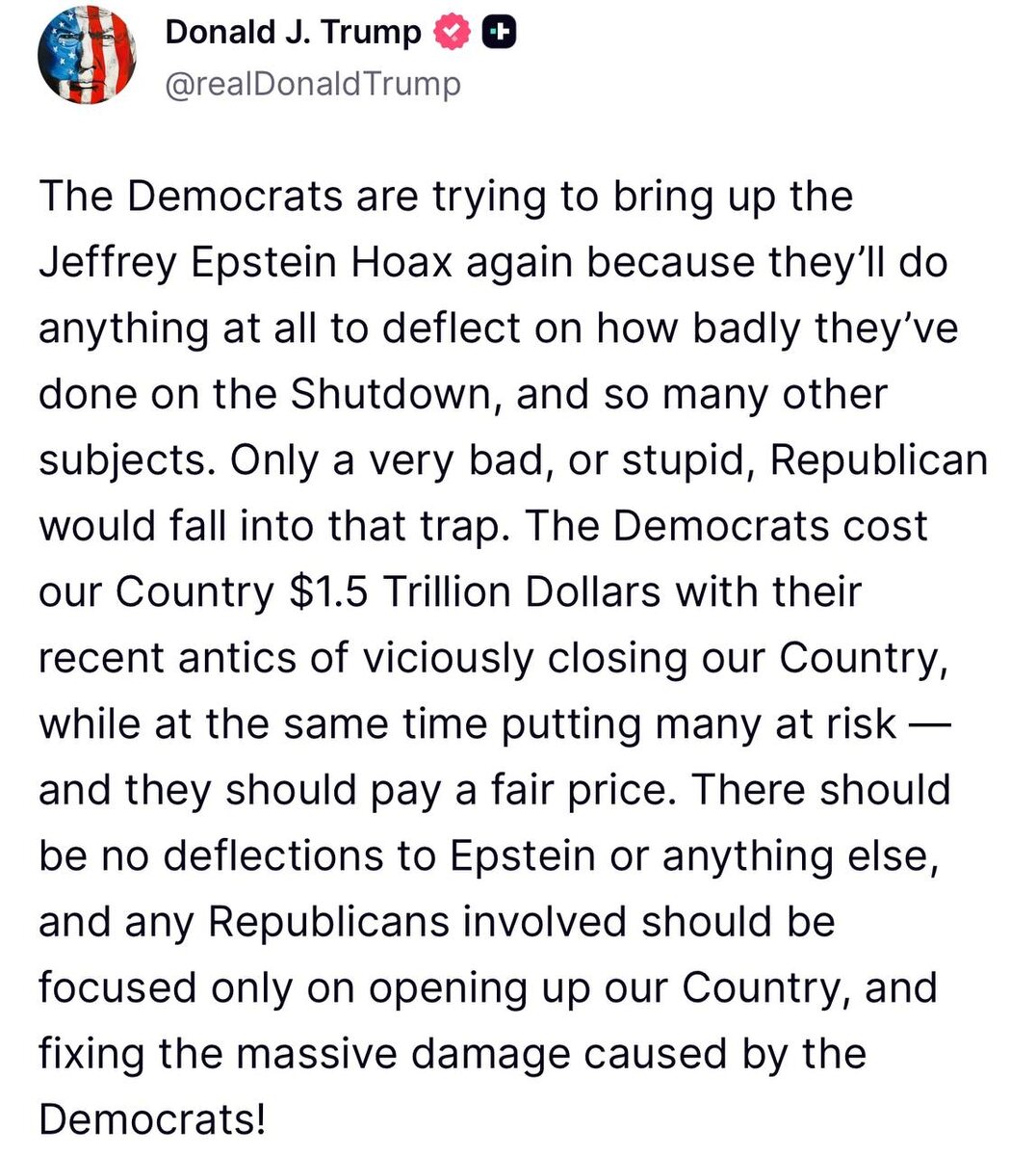 Трамп прокомментировал обвинения после опубликованных писем Эпштейна Мистер Президент молчать не стал. Он заявил, что демократы снова поднимают тему дела Эпштейна, чтобы отвлечь внимание от шатдауна. «Они готовы пойти на все, чтобы отвлечь внимание от того, как плохо выступили в ситуации вокруг шатдауна и многих других вопросов. Только очень плохие или глупые республиканцы попадут в эту ловушку», — сказал Трамп. А вы верите в причастность или непричастность Трампа к делу Эпштейна? 👍 БайБайден. Подписаться