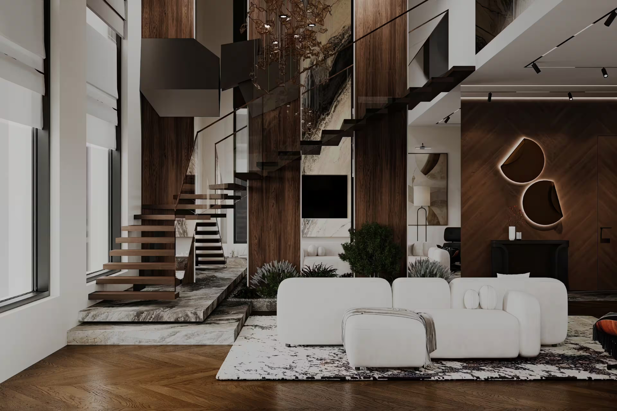Дизайн дома было решено реализовать в контрастной цветовой гамме с использованием молочных и насыщенных коричневых оттенков. Благодаря этому интерьер получился динамичным и выразительным. Сочетание в отделке мрамора и натурального дерева отражает актуальную экоконцепцию. А, чтобы подчеркнуть премиальный характер обстановки, дизайнеры интегрировали в нее элементы в стиле арт-деко: зеркала, эксклюзивные каскадные светильники с подвесками из хрусталя и цветного стекла, мягкие панели с велюровой обивкой. Уюта же интерьеру добавляет биокамин, который установили в ТВ-зоне.