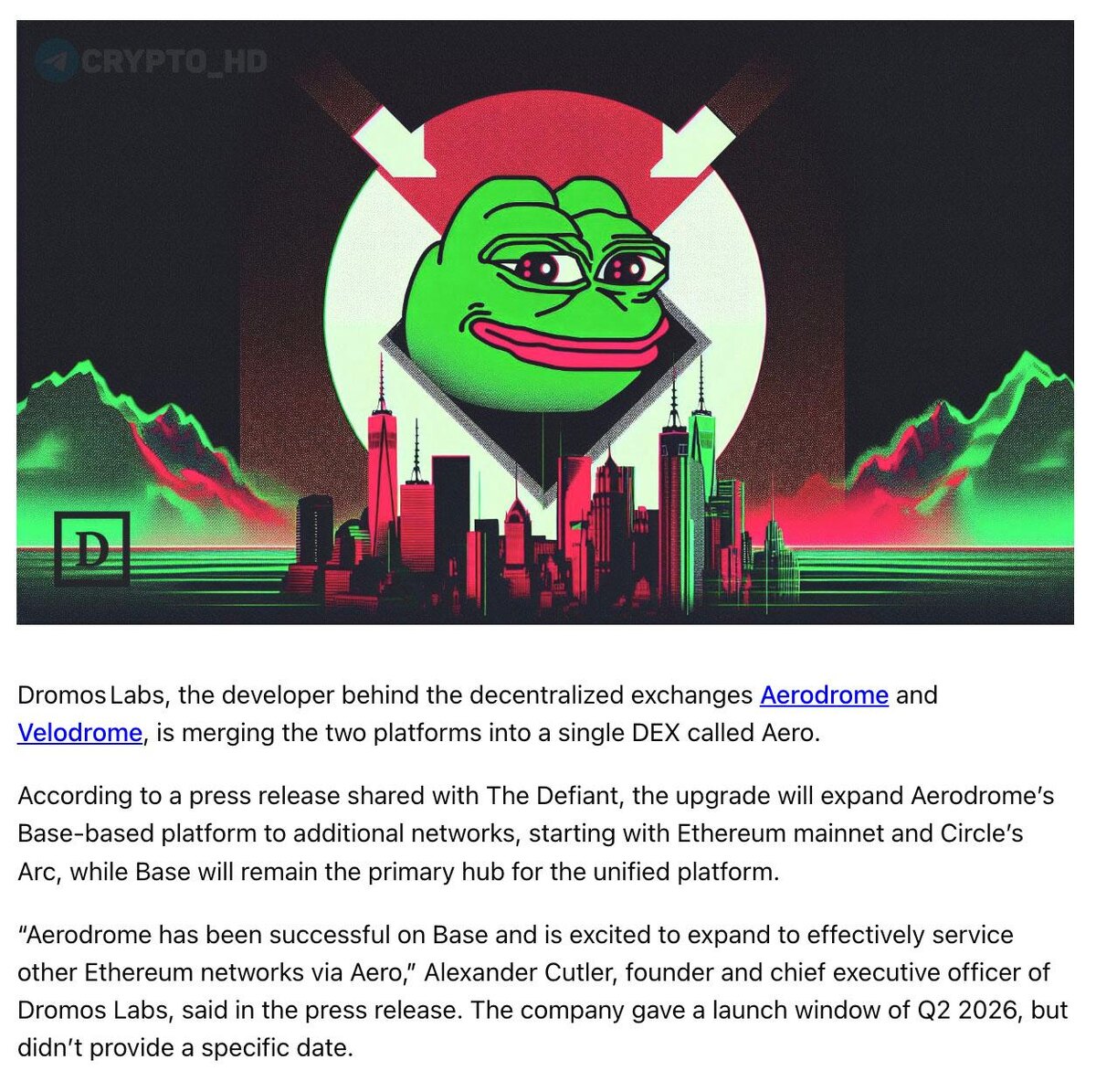 🍸 Aerodrome и Velodrome объединяются в один единый протокол – AERO (анонс) ⮕ Объединенную DEX AERO запустят на блокчейнах Arc (новый L1 от Circle) и Ethereum (#ETH). ⮕ Фактически Aerodrome поглощает Velodrome – текущие токены #AERO и #VELO будут сконвертированы в обновленный AERO. ⮕ Холдеры Aerodrome должны получить ~94,5% аллокации нового токена, а держатели Velodrome = ~5,5% ⮕ Aerodrome и Velodrome – DEX, созданные компанией Dromos Labs, на блокчейнах Base и Optimism (#OP). Ранее: ошибка Uniswap Crypto Headlines