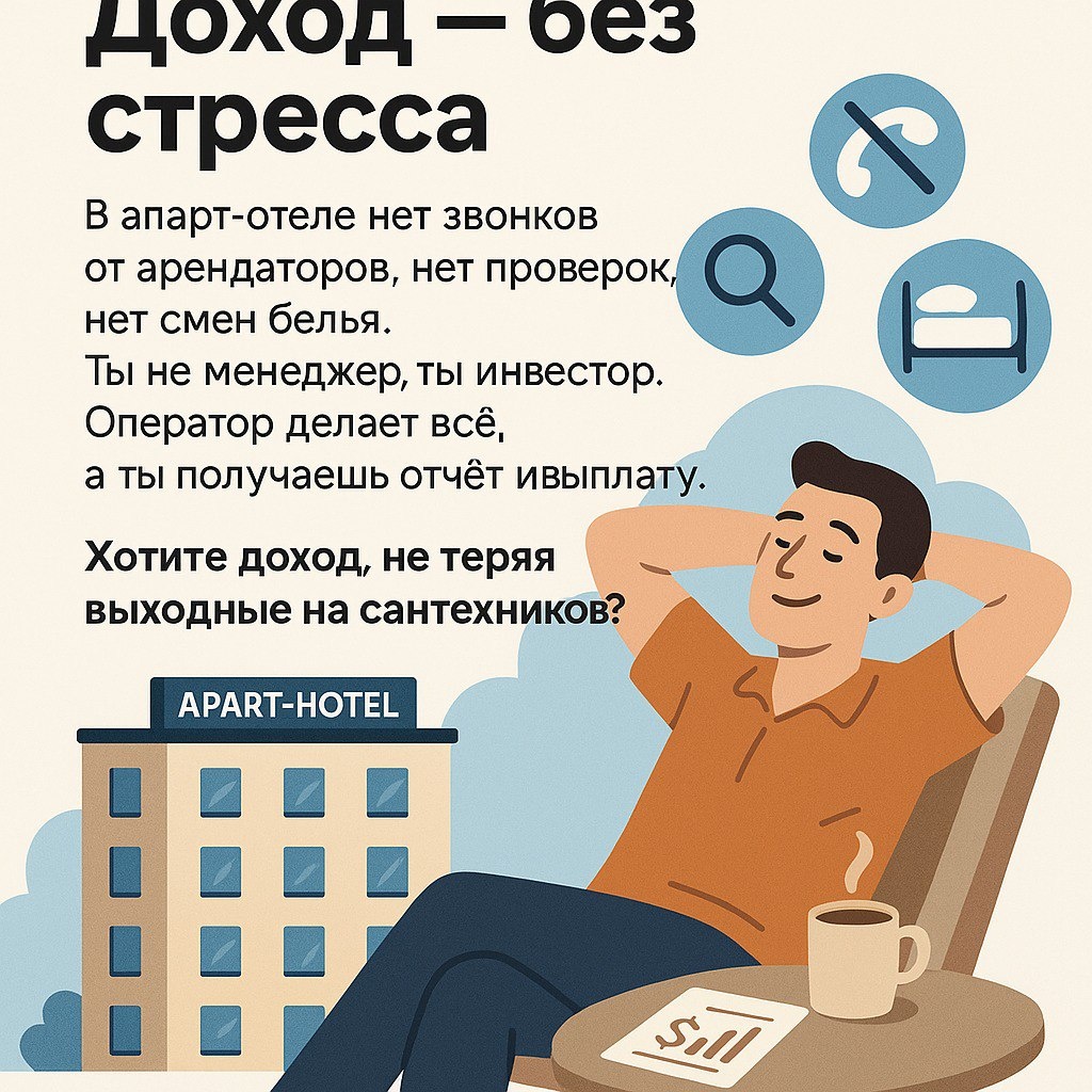 Доход без стресса: почему умные инвесторы выбирают апарт-отели, а не «квартиры у моря» Миф о «квартире мечты» Каждое лето тысячи людей приезжают в Сочи и говорят себе: «Куплю квартиру, буду сдавать посуточно — и деньги сами потекут». На первый взгляд — звучит просто. На деле — это звонки, уборки, потерянные ключи, жалобы, смены белья, переписка с гостями и неожиданности вроде потёкшего бойлера в воскресенье вечером. В итоге вместо инвестора вы становитесь круглосуточным администратором. И отдых превращается в работу. Почему формат «апарт-отеля» снимает головную боль Апарт-отель — это когда ваши апартаменты входят в гостиничный комплекс, а управлением занимается профессиональная управляющая компания. У неё есть: — ресепшен, клининг и служба эксплуатации; — отдел бронирований и рекламы на площадках; — бухгалтерия и система учёта доходов; — команда, отвечающая за сервис и репутацию. Вы просто владелец, а оператор делает всё остальное: размещает апартаменты на площадках — Яндекс.Пут
