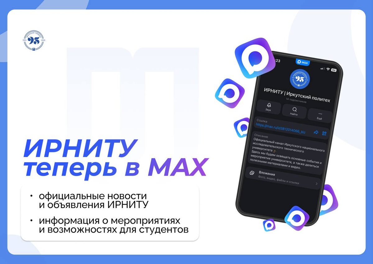 Внимание, важные новости! Мы растем и развиваемся, и чтобы наш диалог с вами стал еще качественнее, комфортнее и безопаснее, мы запускаем официальный канал в мессенджере MAX 📲 Что это даст лично вам? 🔹 Оперативность. Первыми узнавать все новости и получать контент. 🔹 Эксклюзив. Там будет то, чего не найдете больше нигде. 🔹 Обратная связь. Новый формат позволит нам быть ближе к вам. Наш новый канал — это продолжение всего самого ценного, что было у нас здесь, плюс много эксклюзивного контента! Поддержите нас в новом начинании — подпишитесь на канал всего в один клик: 📲 ИРНИТУ | Иркутский политех