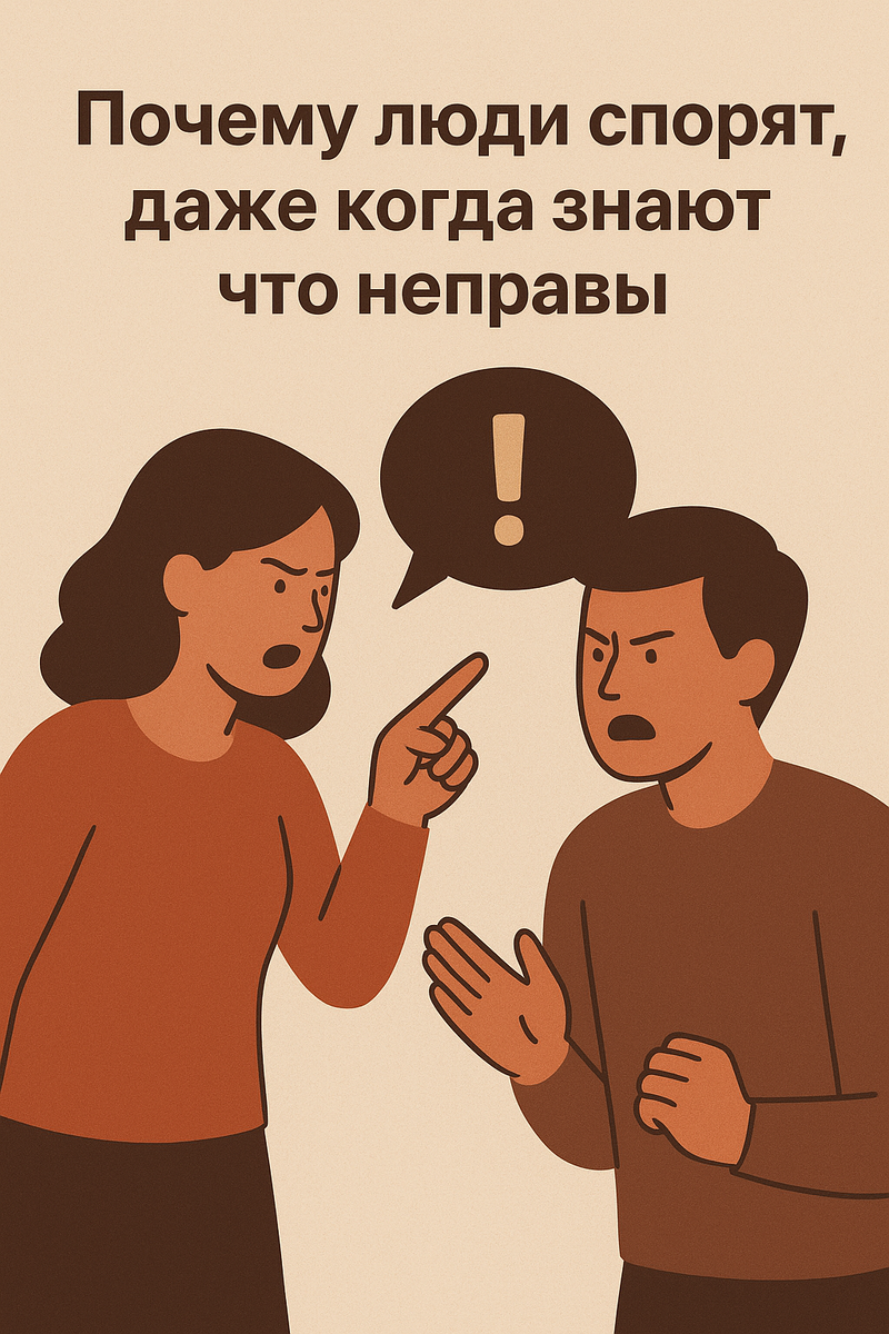 🧩 Вы когда-нибудь ловили себя на том, что продолжаете спорить, хотя внутри уже ясно понимаете — вы ошиблись? Вместо того чтобы признать это, вы начинаете искать оправдания, подбирать аргументы, уходить в эмоции. Почему так происходит? Почему человеческий мозг порой готов «умереть, но не сдаться» — даже в мелочах?