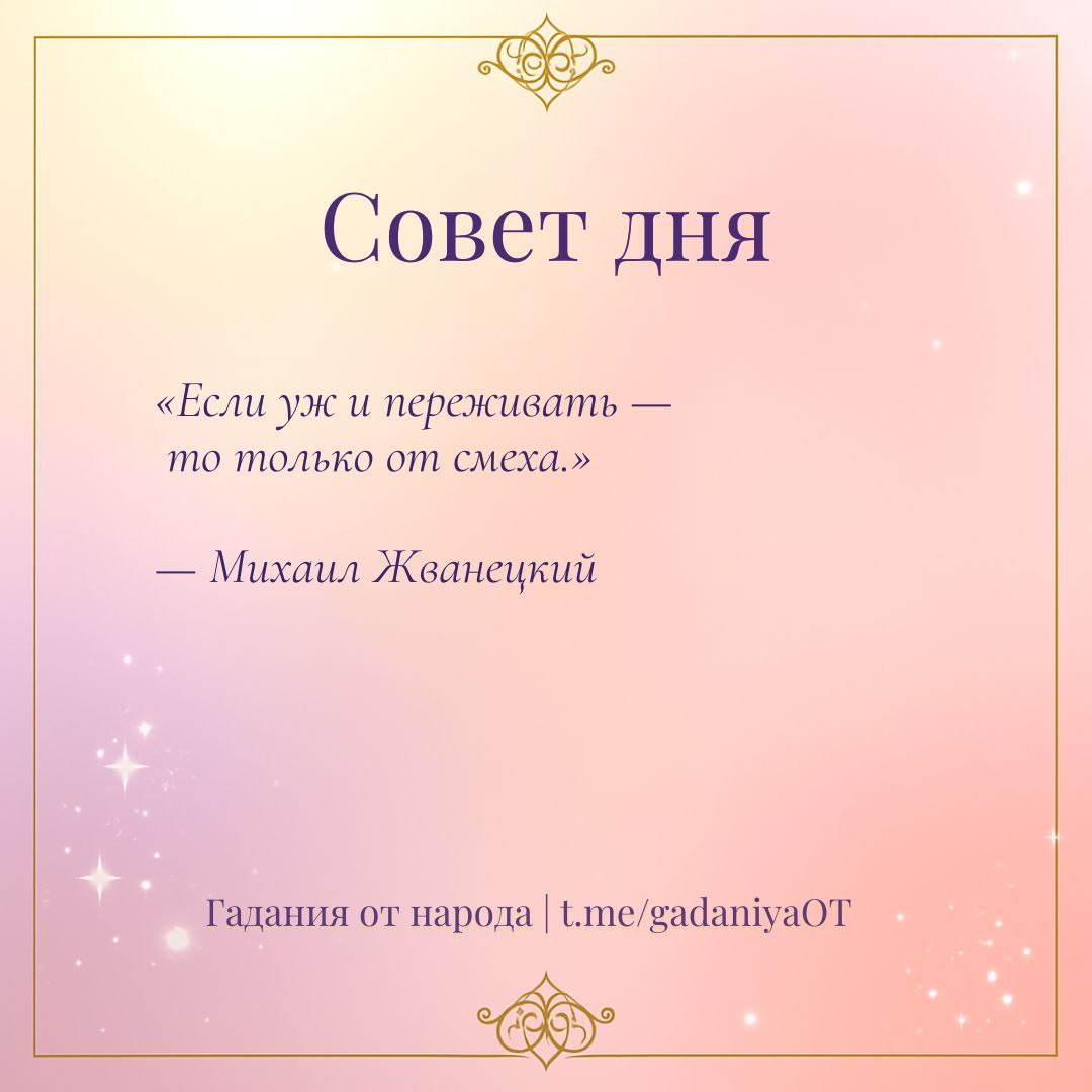 Совет дня Сегодня лучшее лекарство от тревог — ирония. Когда что-то идёт не по плану, попробуйте не анализировать, а улыбнуться ситуации. Иногда лёгкость решает больше, чем сто размышлений. Смех возвращает энергию, потому что в нём — принятие. Он говорит: «Я вижу, что жизнь сложна… и всё равно выбираю радость». Пусть сегодня найдётся хотя бы один повод искренне посмеяться.