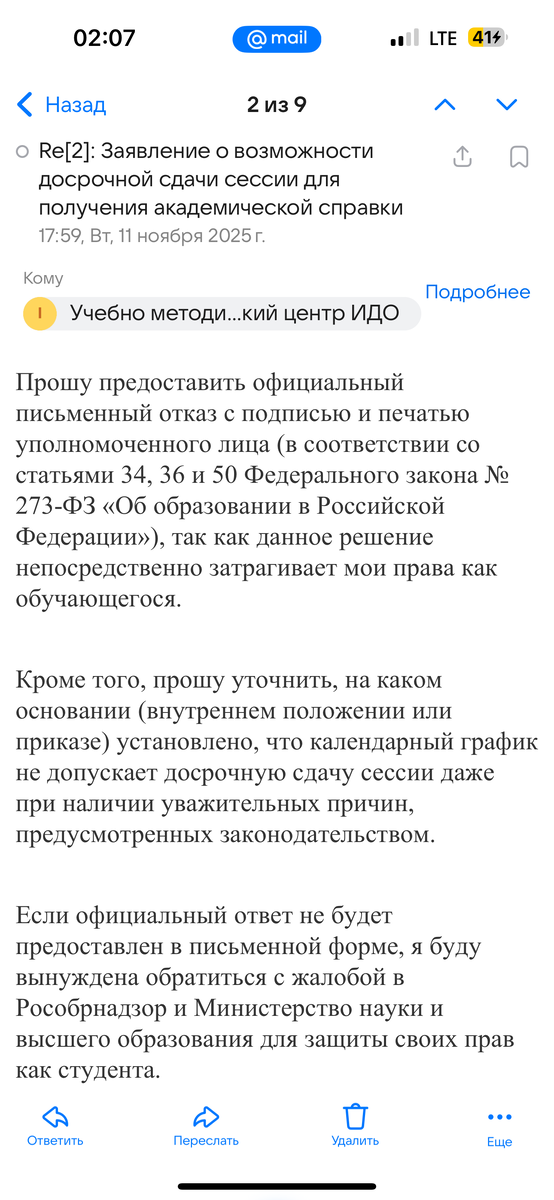 Мой отзыв Факты: • В августе я отправляла пакет документов для зачисления (в 2 экземплярах). На момент публикации прошло три месяца, я до сих пор не получила копии договора об обучении и официального подтверждения зачисления. Мои письма и звонки остаются без внятного ответа. • Учебный процесс по моему направлению устроен формально: лекционные материалы — однотипные текстовые заметки на 1–2 страницы; полноценного конспекта или видеолекций нет. Вместо этого студентов направляют читать толстые учебники (по 350 страниц), а тесты/вопросы по лекциям либо отсутствуют, либо не соответствуют содержанию лекций. У меня в семестре 12 предметов, по каждому — по несколько учебников, и фактически обучение сводится к самостоятельному чтению литературы, а не к преподаванию и разбору материала. • Я приняла решение перевестись. Для этого нужно было получить академическую справку, но есть проблема, во всех институтах сессия в январе, а у них на первом курсе в феврале, я считаю это сделано специально, что