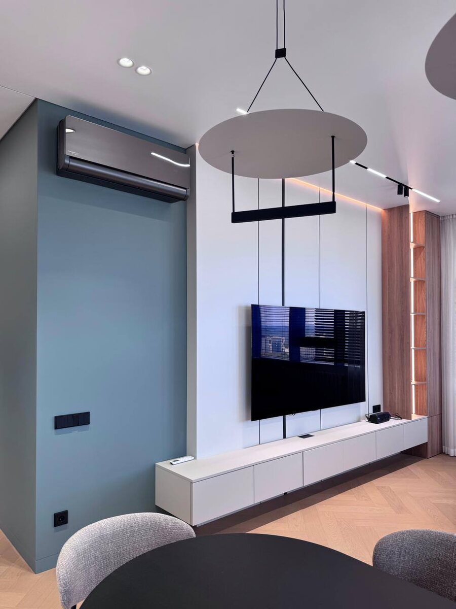 Цвет стен повторяется в гостиной, соединенной с кухонной зоной. В качестве зонирования пространства использован стол и световые решения. Вся мебель в квартире выполнена под заказ с индивидуальными размерами.