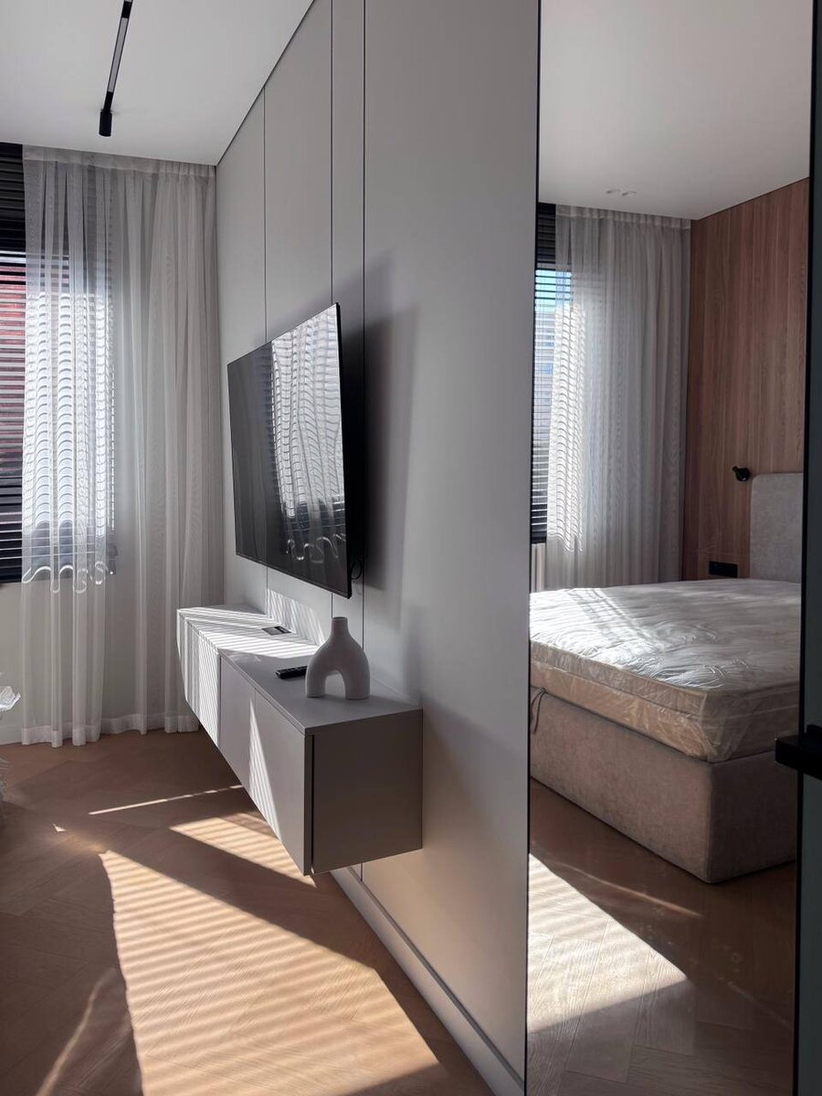 Небольшая спальня выполнена в светлых тонах. Настенные панели обрамляющие изголовье кровати мягко сочетаются с напольным покрытием и дарят ощущение теплоты и гармонии.