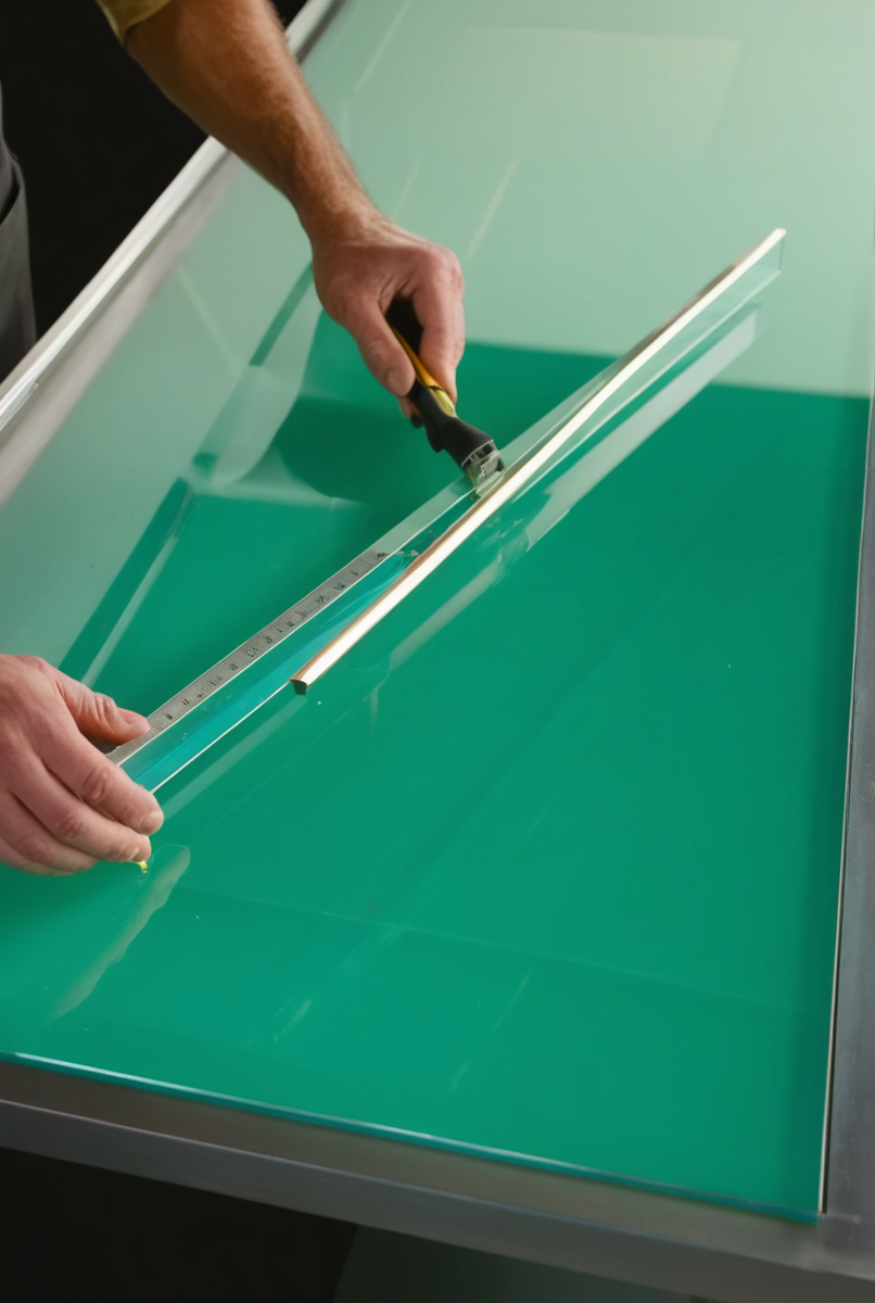 Освоение вопроса, как резать стекло, начинается с правильной постановки руки. Процесс, известный как раскрой листового стекла, требует уверенности и точности. Инструмент следует держать как карандаш, соблюдая почти перпендикулярный угол наклона к стеклянной поверхности.