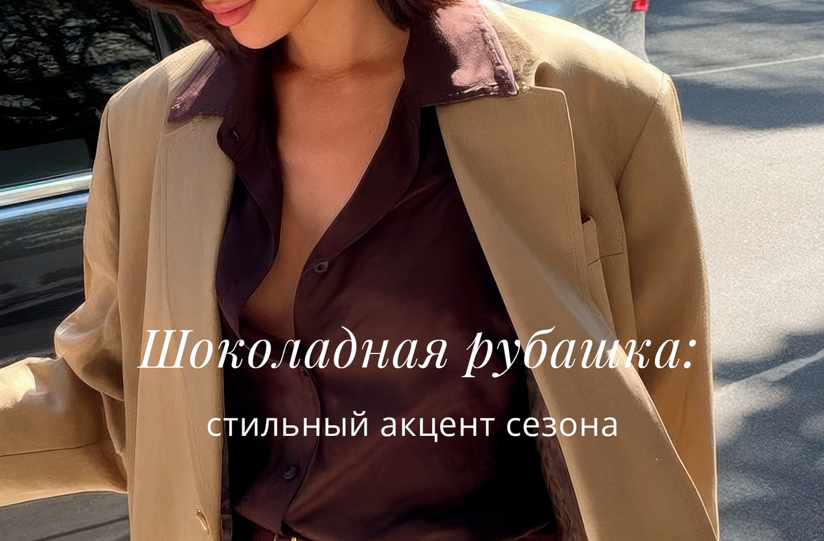 Потому что работает буквально везде: в офисе, на прогулке, в вечернем образе и в капсульных сочетаниях на каждый день. Шоколадный цвет делает комплект глубже, визуально богаче и помогает создавать стиль без лишних усилий. Ниже — пять сочетаний, которые легко повторить с шелковой рубашкой в этом оттенке. Шоколадная шелковая рубашка в дуэте с тёплым бежем выглядит спокойно, дорого и очень сбалансированно. Такой образ идеально подходит для работы, деловых встреч и насыщенных городских будней. Он остаётся элегантным, даже если день расписан по минутам. Более женственная и мягкая комбинация: карамельный жакет, атласная юбка и блеск шелка. Фактура тканей создаёт красивое, спокойное сияние, не перегружая о