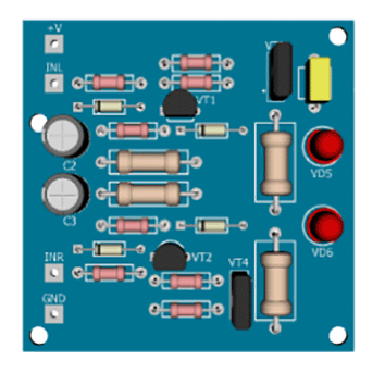 В большинстве случаев регулировка стереобаланса проводится на слух или по положению ручки регулятора баланса. В этой публикации рассказано об индикаторе стереобаланса, для его точной регулировки. Работа индикатора довольна проста: если уровни сигналов на выходах обоих каналов одинаковы, то ни один из светодиодов VD5, VD6 не работает. Когда уровень сигнала в левом канале становится больше, чем в правом, загорается светодиод VD5. Или наоборот: если уровень сигнала больше на выходе правого, загорается VD6. Оба светодиода светиться вместе не могут. Входное напряжение, снятое с выходов УМЗЧ, через резисторы R1, R2, выпрямляется диодами VD1, VD2, и чем выше амплитуда переменного напряжения на обоих входах индикатора, тем выше постоянное напряжение на конденсаторах фильтра С2, С3. Допустим, что уровень сигнала в левом канале стал больше, чем в правом. Значит, конденсатор С2 зарядится больше, чем С3. Транзистор VT1 включен таким образом, что напряжение на его базу поступает с конденсатора С2,