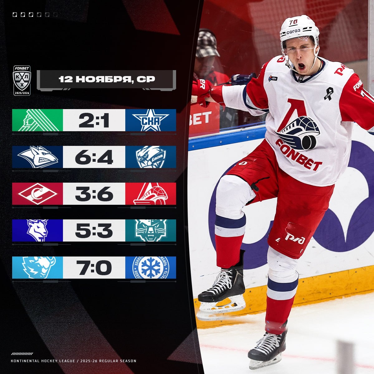 12 ноября получился горячим и разнообразным — днём, где было всё: драмы, эмоции и хоккей без передышки. Игры начинались спокойно, но очень быстро лед превратился в арену настоящих штормов. Команды не жалели себя, а интрига жила почти в каждом матче. Это был день, когда КХЛ снова доказала — скучных вечеров здесь не бывает. Локомотив — Спартак 6:3 Ярославль включился по полной. «Локо» не просто обыграл «Спартак» — он показал, что умеет доминировать. Дубль Герната, мощный прессинг и уверенность в каждом движении. Москвичи пытались цепляться, но чем дальше — тем больше поезд набирал ход. Звон шайб, крики трибун и шестёрка голов на табло. Классика от железнодорожников. Салават Юлаев — СКА 2:1 Матч, где Уфа снова показала характер. СКА боролся, владел шайбой, но проблемы в атаке всё те же — нет остроты. Салават действовал строго, выверенно, и наказал за каждую ошибку. Питерцы вновь ищут баланс, а уфимцы просто делают своё дело — берут очки и двигаются вперёд без лишнего шума. Д
