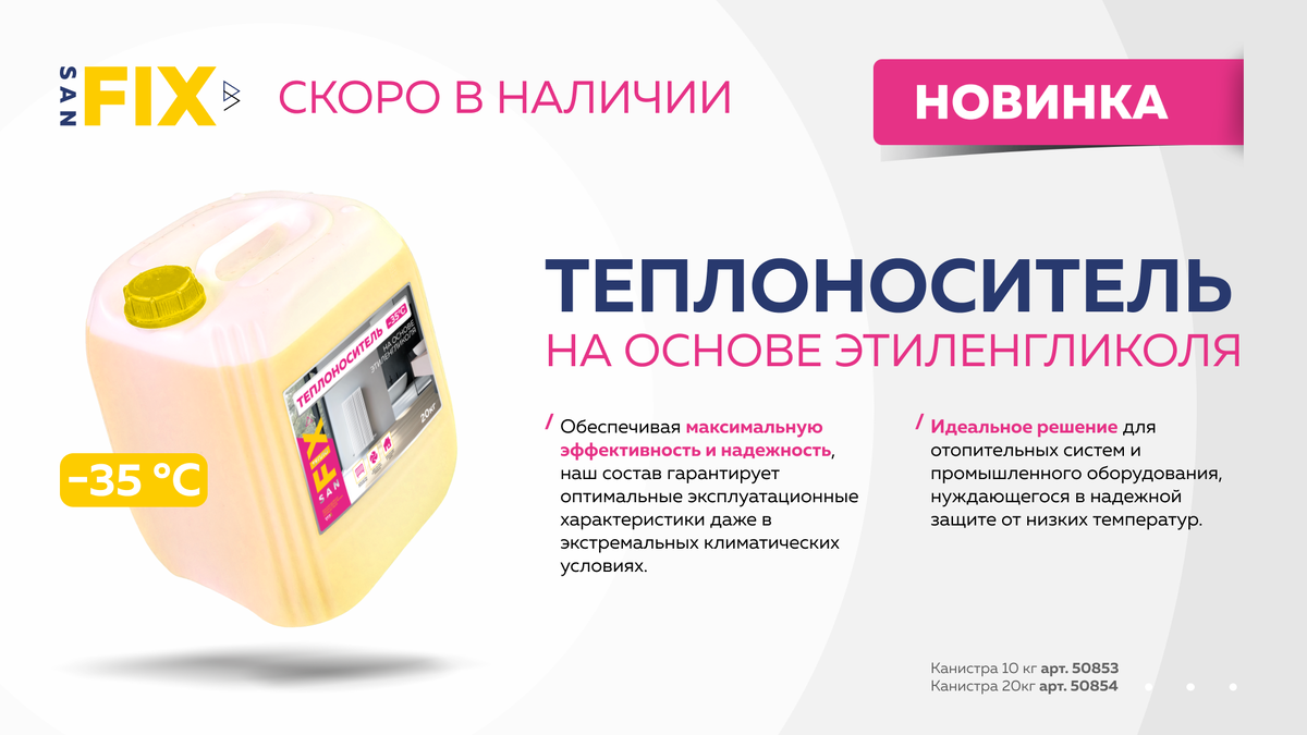 Всем привет, друзья! 👋 Рады поделиться с вами отличной новостью от SANFIX! 🎉 Вы просили – мы сделали! Представляем нашу новинку: ТЕПЛОНОСИТЕЛЬ -35°C на основе этиленгликоля! ❄️🔥 Этот теплоноситель создан специально для тех, кто ценит качество и надежность в системах отопления и кондиционирования. Он отлично подходит для работы при низких температурах, обеспечивая стабильную и эффективную работу вашего оборудования даже в суровых условиях. 🏠💨 Почему стоит выбрать именно наш теплоноситель?