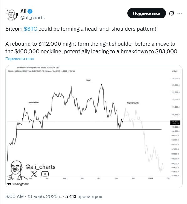 Если отобьёмся до $112 000 и сформируем правое плечо, то дальше — падение к "шее" в $100 000, а там и до $83 000 недалеко.