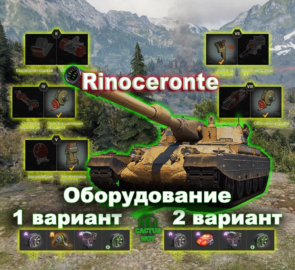 🇮🇹 Rinoceronte 🉑Тяжелый танк поддержки 10 уровень. ⛏Оборудование и полевая модернизация на картинке🔼 ➕Плюсы танка 📈 система дозарядки на 3 снаряда на 490 урона каждый; 📈хорошее бронепробитие основного снаряда; 📈хорошие углы склонения орудия; 📈небольшие размеры относительно основных тяжей; 📈подвижность. ➖Минусы танка 📉запас прочности как для тяжелого танка маловат; 📉время перезарядки в барабане долгое; 📉время общей зарядки барабана долгое. ⬇️⬇️⬇️⬇️⬇️⬇️⬇️⬇️ #базазнаний@CactusWOT #Rinoceronte@CactusWOT #миртанков