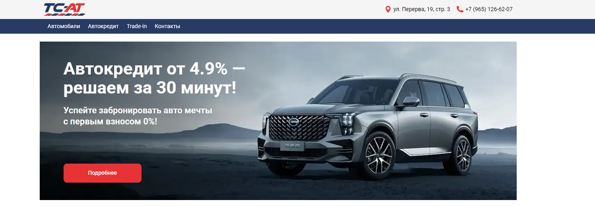 TC-AT — это автосалон в Москве. Занимается продажей новых автомобилей. Реальный владелец предпочитает оставаться анонимным. На картах есть фейковые положительные отзывы. Больше интересного — в нашем обзоре. В автосалоне на улице Перерва 19 стр 3 в Москве можно купить новый автомобиль. Салон является мультибрендовым, в его онлайн-каталоге содержится более 20 марок. Также дилер выступает в качестве кредитного брокера: клиенты могут на месте оформить кредит на автомобиль. Помимо этого покупателям предлагают воспользоваться программой Трейд Ин (Trade In). Нас смущает то, что ценовое предложение не закреплено документально. Кроме того, для нас подозрительным является тот факт, что салон находится по тому же адресу, что и Марьино Центр и PERERVA CAR. Все эти дилеры есть в нашем черном списке. В качестве владельца автоцентра TC-AT в футере сайта указано ООО «ПРЕМИУМ РЕКЛАМА» (ИНН: 5263108187). Мы неоднократно писали об этой компанией, которая является рекламным агентством. Принять эту фирму