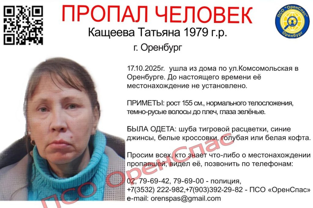 В Оренбурге полиция и волонтеры разыскивают без вести пропавшую 46-летнюю Татьяну Викторовну Кащееву. 17 октября женщина ушла из дома по ул. Комсомольская и до настоящего времени ее местонахождение не установлено. Татьяна Кощеева ростом 155 см., нормального телосложения, волосы темно-русые до плеч, глаза зеленые. В момент ухода из дома была одета в шубу тигровой расцветки, синие джинсы, белые кроссовки и в голубую или белую кофту. Всех, кто знает что-либо знает о местонахождении пропавшей, видел ее, просят позвонить по телефонам: 02, 79-69-42, 79-69-00 — полиция, +7(3532) 222-982, +7(903)392-29-82 — ПСО «ОренСпас» e-mail: orenspas@gmail.com Фото: ОренСпас 18+