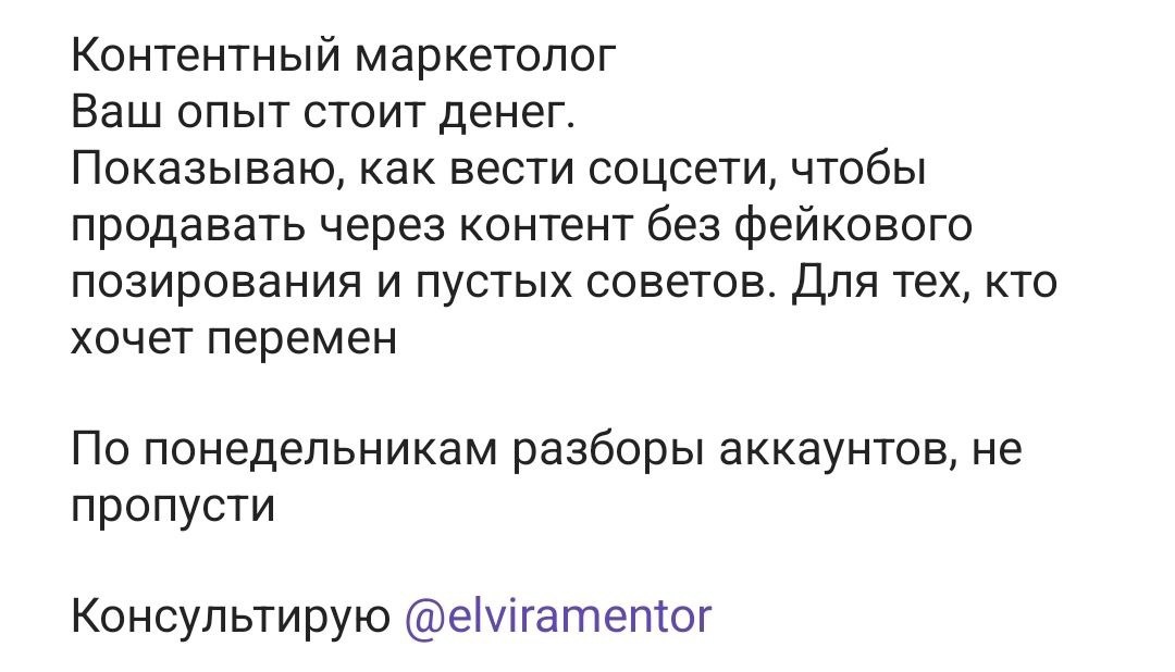 Шапка- самое дорогое, что у нас есть Потому что мы слишком много вкладываем усилий, чтобы сделать ее идеальной. А 80%человек ее не читают. Единственный вопрос, на который она должна отвечать- это зачем нужно подписаться на ваш канал. Я хочу написать вот так: Работаю с: психологами, астрологами, целителями. Подпишись, если хочешь продавать не "энергию", "гармонию" и "баланс", а реальные результаты и чтобы клиенты верили, понимали и покупали По ПН анализ аккаунтов, не пропусти Консультирую @elviramentor Как вам такое описание?