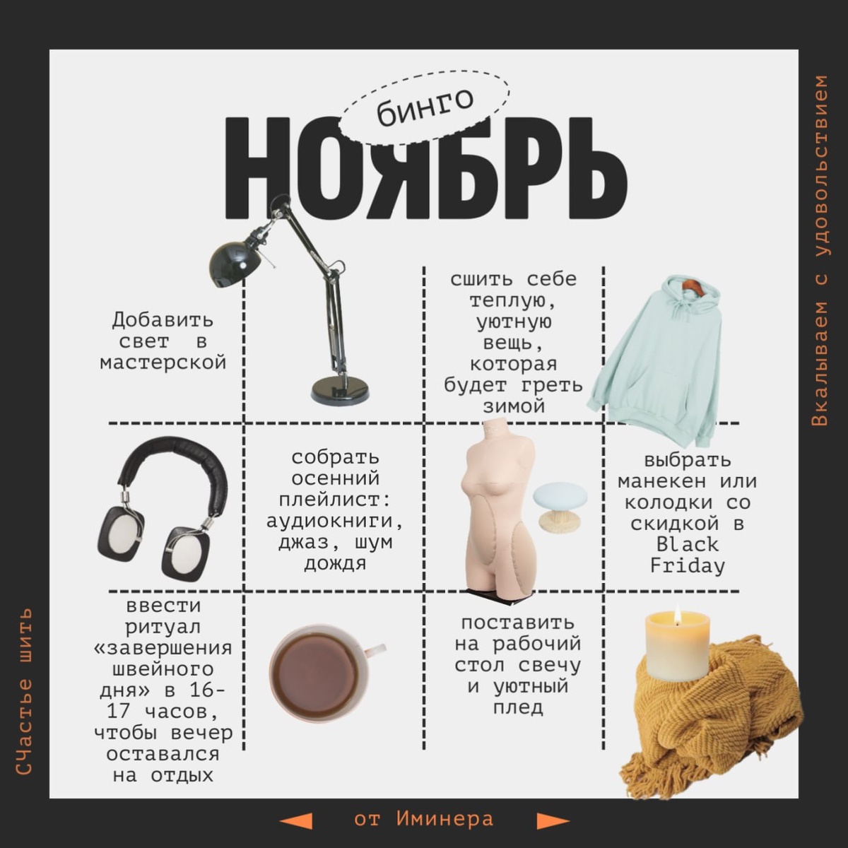 Пора готовится к зиме ❄️ Создать свет и уют в мастерской - Протереть окна и убрать рабочие поверхности, чтобы пропускать максимум света. - Организовать дополнительное освещение: поставить яркую, но теплую по тону лампу прямо у швейной машины, чтобы не уставали глаза. - Проверить батареи и создать себе «теплый уголок» — плед, термос с чаем и удобное кресло. ❄️ Подвести итоги и спланировать новый год - Пересмотреть готовые работы, похвалить себя и выписать главные достижения. - Провести «осенний детокс» для идей: разобрать папку с вдохновением, оставить только те проекты, которые действительно хочется реализовать. - Составить спокойный, реалистичный план, чтобы предстоящие праздники и зима прошли спокойно. ❄️ Практичные покупки и уход за техникой - Воспользоваться BLACK FRIDAY от Iminera, чтобы купить то, что откладывала весь год (iminera.ru). - Особо тщательно почистить машину от пыли и ворса — в отопительный сезон ее становится больше. - Проверить влажность в комнате, если воздух ста