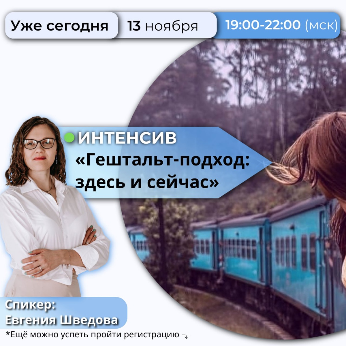 ⏺Напоминаем: уже сегодня состоится онлайн-интенсив «Гештальт-подход: здесь и сейчас» Бывает, мы застреваем в одних и тех же переживаниях - возвращаемся к боли снова и снова. Гештальт-подход помогает завершить незавершённое, вернуть энергию и контакт с собой. Если вы ещё не успели зарегистрироваться - у вас есть шанс запрыгнуть в последний вагон. 🚆 🕓 Начало уже сегодня, 13 ноября, в 19:00 (МСК) 3 часа практики, осознаний и техник возвращения «здесь и сейчас». 👤Спикер: Евгения Шведова Клинический психолог, аккредитованный гештальт-терапевт и супервизор. Ждем вас по ссылке ниже. (места ещё есть) Записаться на интенсив ↖️