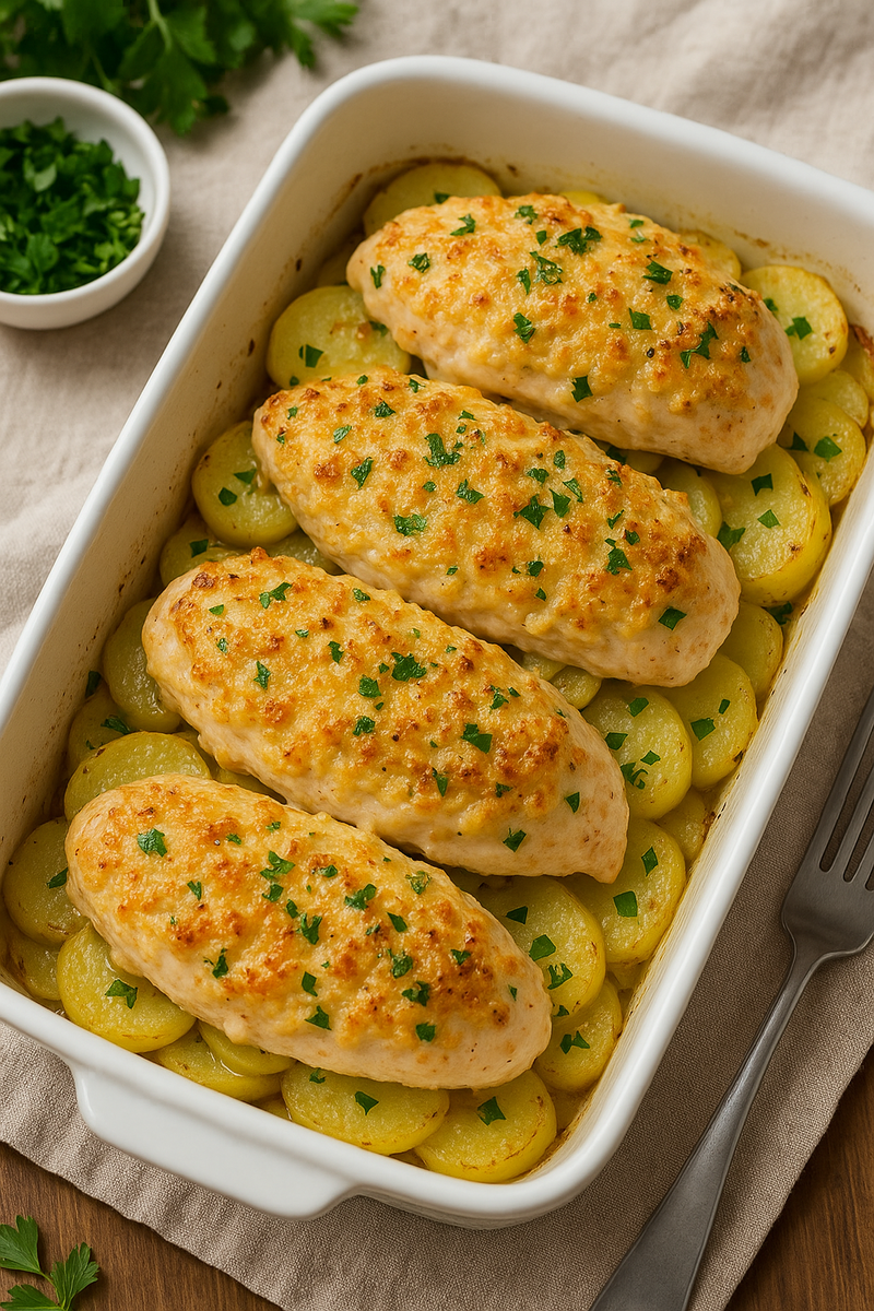 - Если хотите ресторанный вид — выкладывайте слоями на тарелку: картофель, курица, немного соуса из формы.