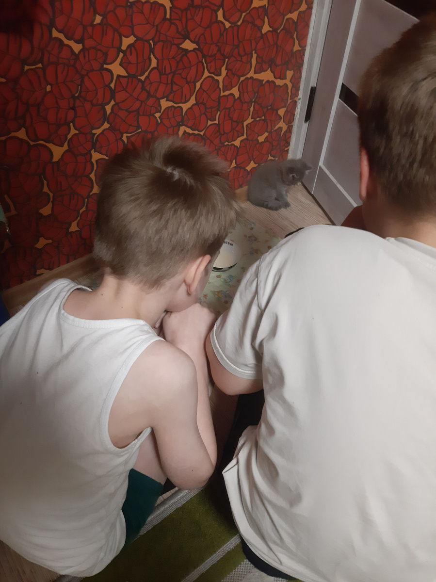 Мы приехали домой,позвали детей,они не сразу увидели у меня запазухой "сюрприз", а когда увидели замерли и не знали что сказать от счастья, это было для них неожиданно.Котенок с опаской обнюхивал комнаты,мы постелили ему пеленочку и налили молока,а дети всё не расходились — сидели рядом, не отрывая взгляда от маленького пушистого комочка. В их глазах читались восторг и трепет: казалось, они боялись спугнуть это маленькое чудо неосторожным движением.