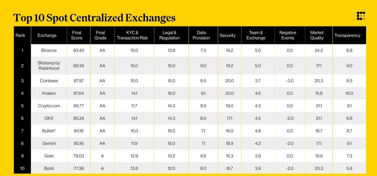 CoinDesk опубликовали ежегодный Exchange Benchmark 2025 🎖 CoinDesk опубликовали ежегодный Exchange Benchmark 2025, в котором Binance заняла первое место среди централизованных бирж и получила высший рейтинг AA — единственная платформа, набравшая более 90 баллов как в спотовой (93.4), так и в деривативной торговле (93.65). Аналитики отмечают, что сектор криптобирж демонстрирует устойчивый рост зрелости и прозрачности: почти 60% площадок работают под надзором регуляторов, всё больше компаний публикуют Proof-of-Reserves и отчёты. По данным CoinDesk, крупные биржи сегодня становятся более надёжными и институционально устойчивыми, чем пять лет назад.