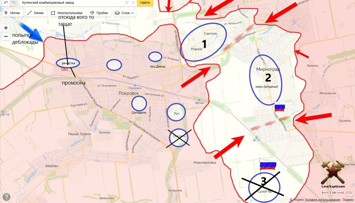 Мирноградский котел. Южная отсечка ВСУ с центром в н.п.Сухой Яр(№3) прекратила свое существование. ВС РФ вышли на окраины микрорайона Западный. схемы и карты