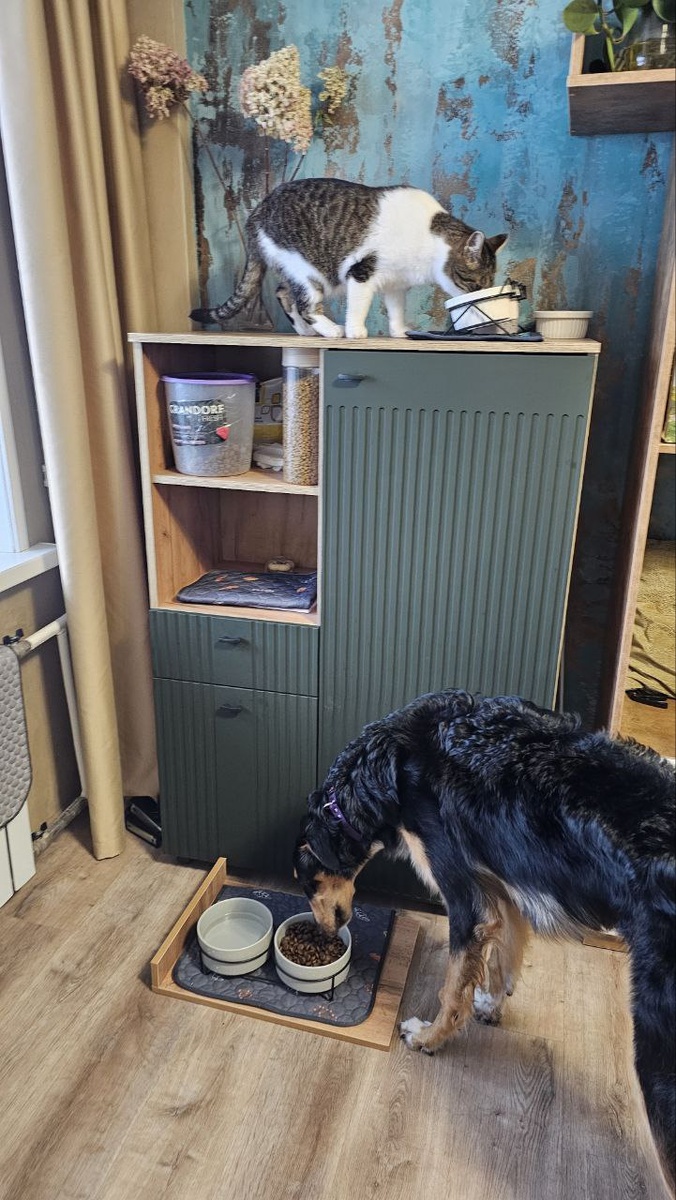 Про борзого. В опроснике узнала о таком запросе)) После косметического ремонта (правда, чуть не доделанного, краска кончилась) я пацанов с их едальней переселила в угол в зале. Кота - наверх, пса вниз. Кот несколько дней привыкает к новому месту, а Пит совершенно нормально воспринял перемены. Зато теперь я по ночам не просыпаюсь от хруста кормом кота, а днём пёс не перегораживает сплошным забором-спиной вход на кухню. Вот думаю, как стенку продадим, там устрою им запланированную харчевню. Может, поилку псу поставлю чуть повыше от пола, на невысокую тумбочку. Кот тоже из неё привык пить)) Знаю, что люди ещё клетки собакам ставят, чтобы они себя чувствовали в безопасности и не пакостили, пока хозяев нет дома. Но я работаю из дома, поэтому такой необходимости нет, да и места тоже.