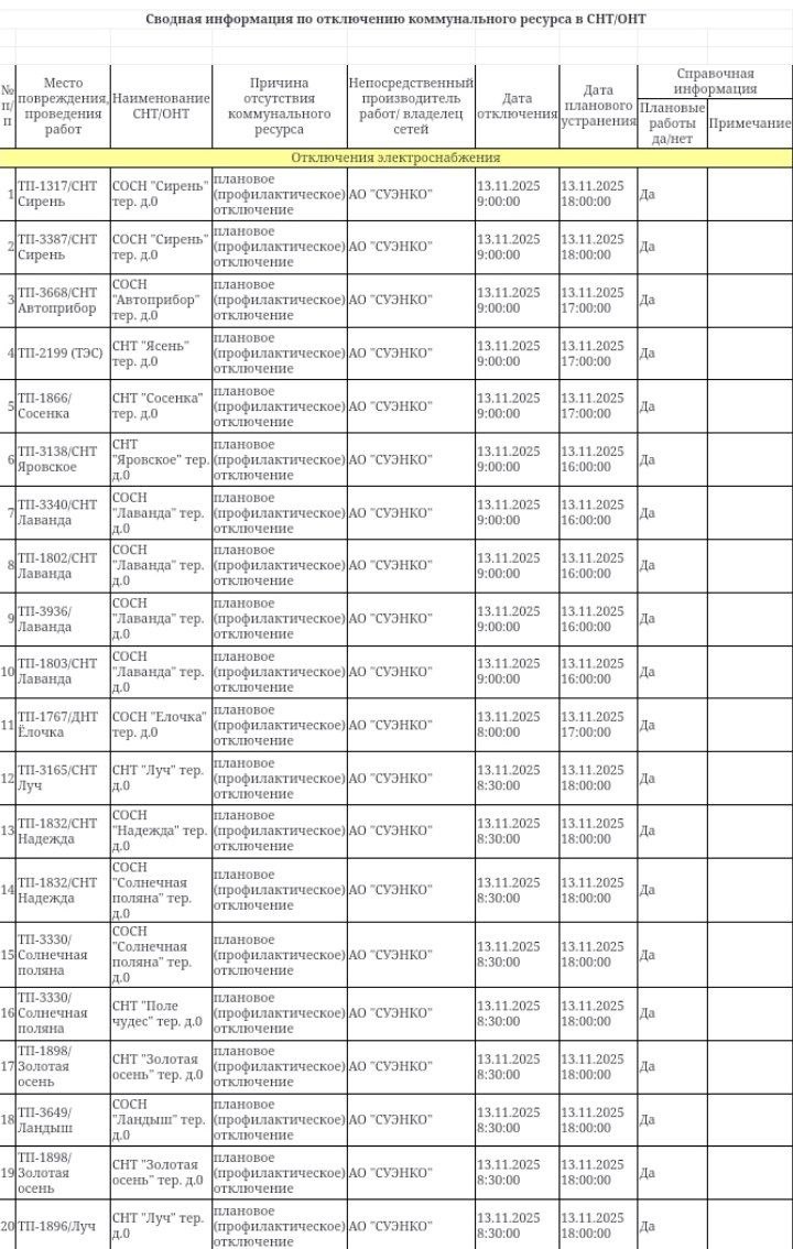Информация по плановым отключениям в СНТ/ДНТ на 13.11.2025 от ЕДДС города Тюмени
