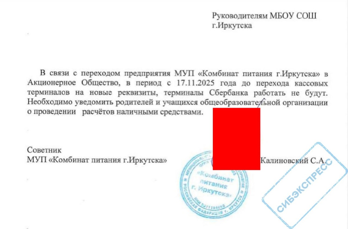 Уволенного после скандала гендиректора иркутского «Комбината питания» пристроили советником на этом же предприятии Бывший директор иркутского муниципального предприятия «Комбинат питания» Сергей Калиновский остался в этой компании. Ему дали должность «советника», следует из письма по поводу новых реквизитов «Комбината», разосланного в школы города (копия оказалась в распоряжении «Сибирского экспресса»). Бумага подписана самим Калиновским, а не нынешней и.о. директора Юлией Коробковой. Калиновский ушёл в отставку 1 октября, формально — по собственному желанию. Но увольнению предшествовал скандал с обеспечением школ питанием, часть которых остались без горячей еды. Ранее 9 лотов на организацию горячего питания в школах Иркутска на общую сумму 403 млн рублей выиграл «КрасПит», но муниципального «Комбинату питания», который прежде регулярно получал подряды, это не понравилось, и он обжаловал итоги в ФАС. Антимонопольщики подтвердили законность контрактов с «КрасПитом». Но компанию прост