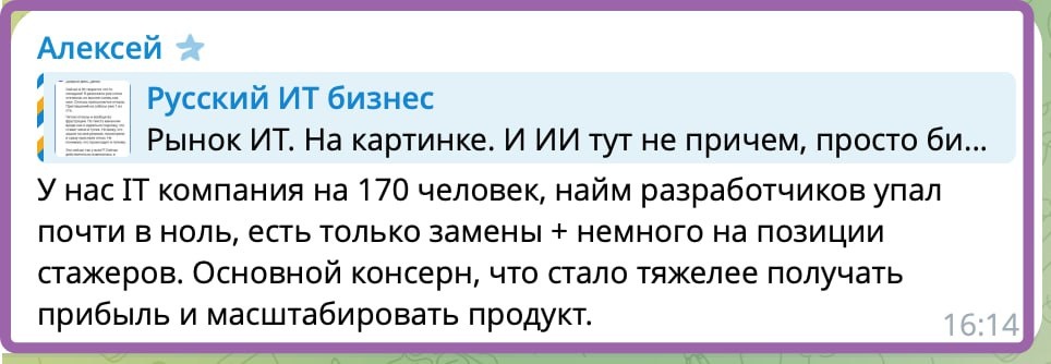 Я же говорю, бизнес в стадии ожидания- выживания вообще, а в ИТ в частности. Вот пишут в чате, спасибо! Почитайте... У нас компания в разы меньше, все аналогичное. Никакого набора, если кто-то уходит (дааавнооо это было), никем не заменяем. Пытаемся не растерять команду :( Русский ИТ бизнес