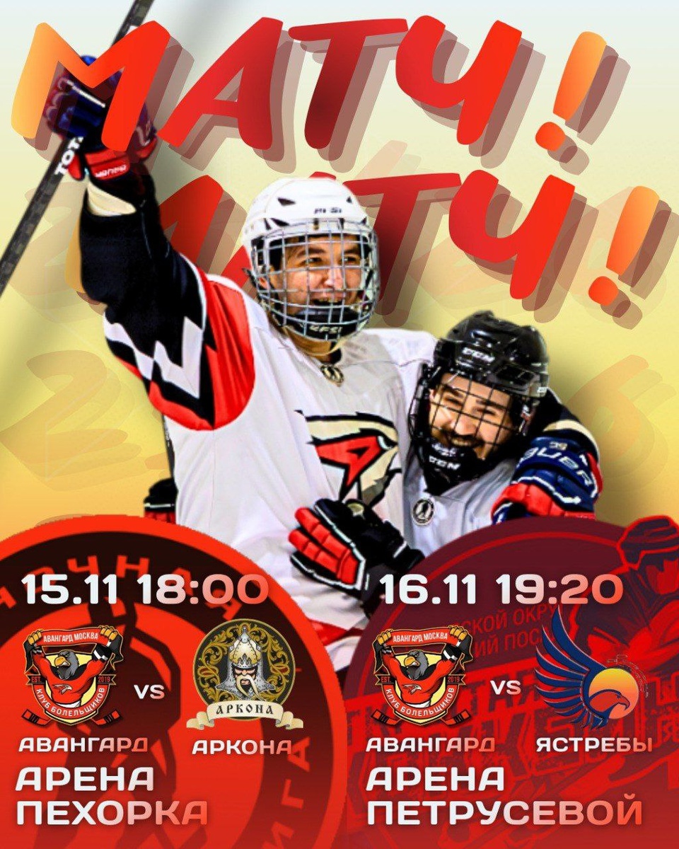 🏒 Выходные пройдут под знаком хоккея! 📅 Суббота — встречаемся на Пехорка Арене! Наш «КБ Авангард» сразится с командой «Аркона». ⏰ Начало в 18:00 — приходите заранее, атмосфера обещает быть жаркой! 📅 Воскресенье — играем на арене Петрусевой (Павловский Посад) против «Ястребов». ⏰ Начало в 19:20! 🔥 Приходите поддержать нашу команду! Нам нужна ваша энергия с трибун! #Хоккей #КБАвангард #Авангард #НочнаяХоккейнаяЛига #ОткрытаяХоккейнаяЛига #ВыходныесАвангардом