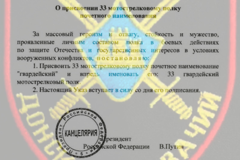 Президент России Владимир Путин присвоил почетное наименование гвардейский 33-му Берлинскому Донскому казачьему полку. Соответствующий указ опубликован на портале опубликования правовых актов. 33-й мотострелковый полк входит в состав 20-й гвардейской мотострелковой дивизии. В тексте указа отмечается, что звание присвоено за проявленные личным составом полка героизм, стойкость и мужество в боевых действиях по защите Отечества и государственных интересов в условиях вооруженных конфликтов.