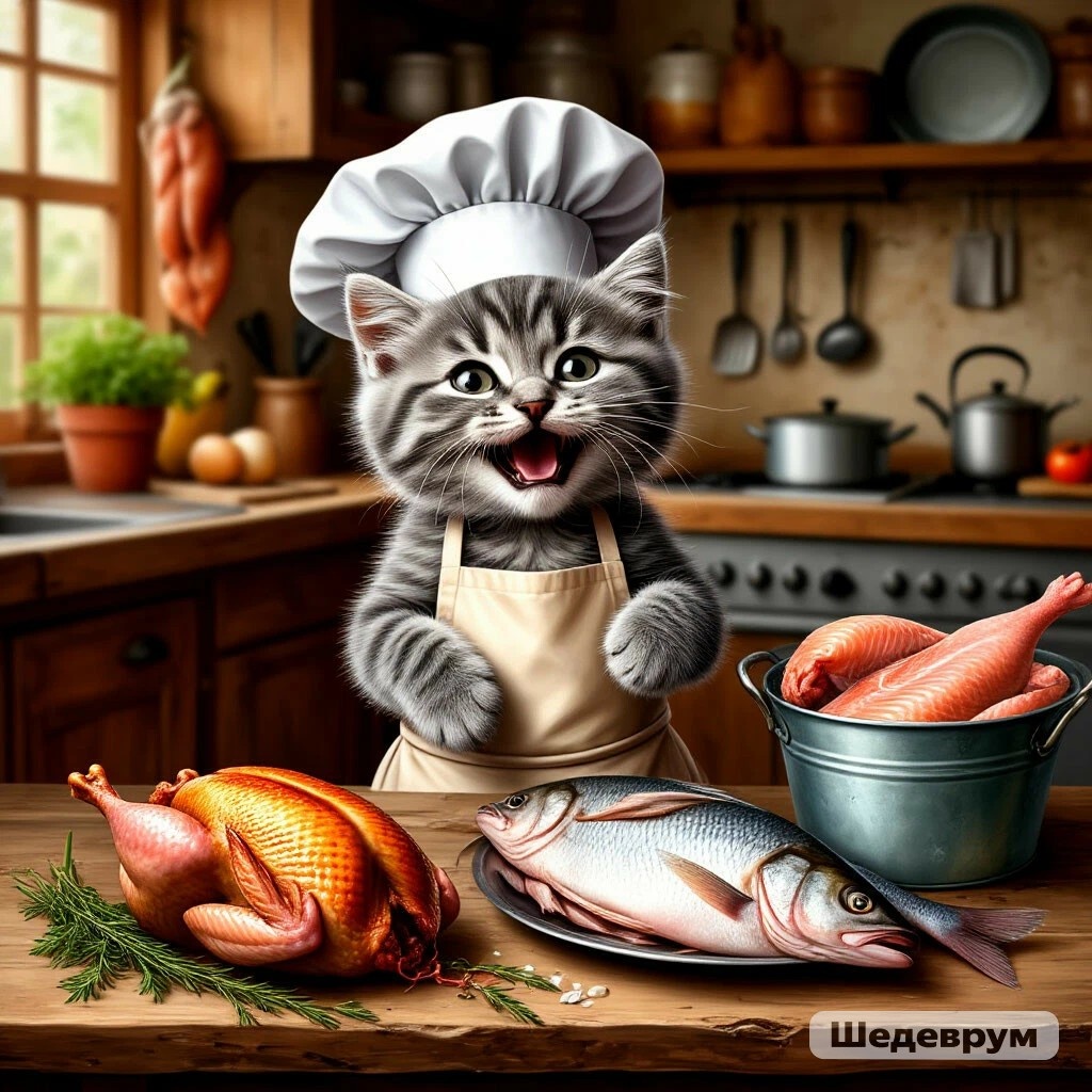 АНОНС НА ЧЕТВЕРГ Мяу, мои пушистые гурманы! 😺 Четверг — а это настоящий кошачий праздник! Знаете почему? Потому что четверг у нас — РЫБНЫЙ ДЕНЬ! 🐟✨ И конечно, день заседания нашего книжного кулинарного клуба! Сегодня будем ловить вкусные рецепты, как настоящие рыбаки! 🎣 А в мире сегодня целых три замечательных праздника: 🏆Всемирный день качества — выбираем только лучшие продукты! 🐔Всемирный день курицы — но мы сегодня за рыбу, простите, курочки! ❤️Всемирный день доброты — делимся вкусненьким с ближними! Наша рыбная программа на день: 🍳 Завтрак: Блины из шпината с рийетом из лосося и анчоусов — изысканное начало дня! 🥗Салат: Камчатский с кальмарами, курицей и яйцами — морское ассорти! 💰Бюджетное блюдо: Спагетти с овощами и кальмарами — всего 133 рубля за порцию! 🍲Суп: Из трески с оливками и каперсами — ароматный и наваристый! 🍤Перекус: Запеченные креветки в хрустящей панировке — удобно брать с собой! 🐟Горячее: Рулетики из тилапии в беконе — шедевр для особого случая! 🥧Вы