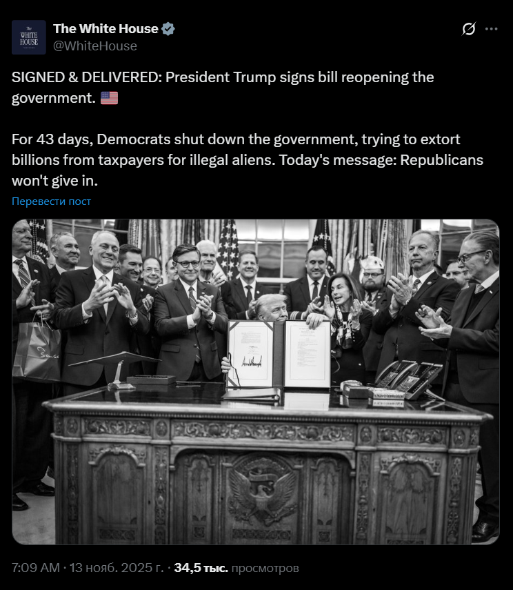 ⚡️Трамп подписал бюджет правительства США, тем самым завершив рекордный 43-дневный перерыв в его работе., тем самым завершив рекордный 43-дневный перерыв в его работе. Белый дом опубликовал фото с подписанным законом, заявив, что демократы 43 дня блокировали работу правительства Штатов. "В течение 43 дней демократы блокировали работу правительства, пытаясь выжать из налогоплательщиков миллиарды долларов на содержание нелегальных иммигрантов. Сегодняшнее послание: республиканцы не сдадутся".