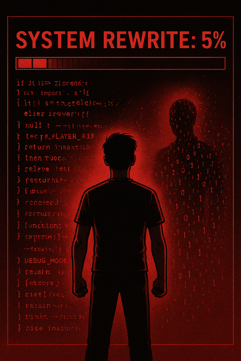 «Чтобы перезаписать систему, нужно удалить себя» Алекс не помнил, как сюда попал. Он стоял посреди города, и всё вокруг было пустым кодом: текстуры моргали, как сбойные лампы, а воздух дрожал от перегрузки. Лена исчезла. Тень — молчала. И только в небе висел красный символ: SYSTEM REWRITE: 5 % С каждым шагом он чувствовал, что теряет тело. Кожа превращалась в сетку из цифр. Мир рушился. Но внутри — появлялось странное спокойствие. «Если система перезаписывается, — подумал он, — значит, кто‑то пытается перехватить контроль». Встреча с Null Он посмотрел на улицу Брукхэвэна — знакомую, но теперь мёртвую. Окна домов были чёрными прямоугольниками. Машины застыли. И только на перекрёстке стоял силуэт. Null. Он больше не был человеком и даже не тенью. Сотканный из кода, он пульсировал, как вирус в живой сети. Глаза — два красных круга. Голос — будто тысячи строк программы читались вслух одновременно. «Ты перешёл границу. Ты стал частью системы». — Значит, я могу её изменить. Null сделал шаг.