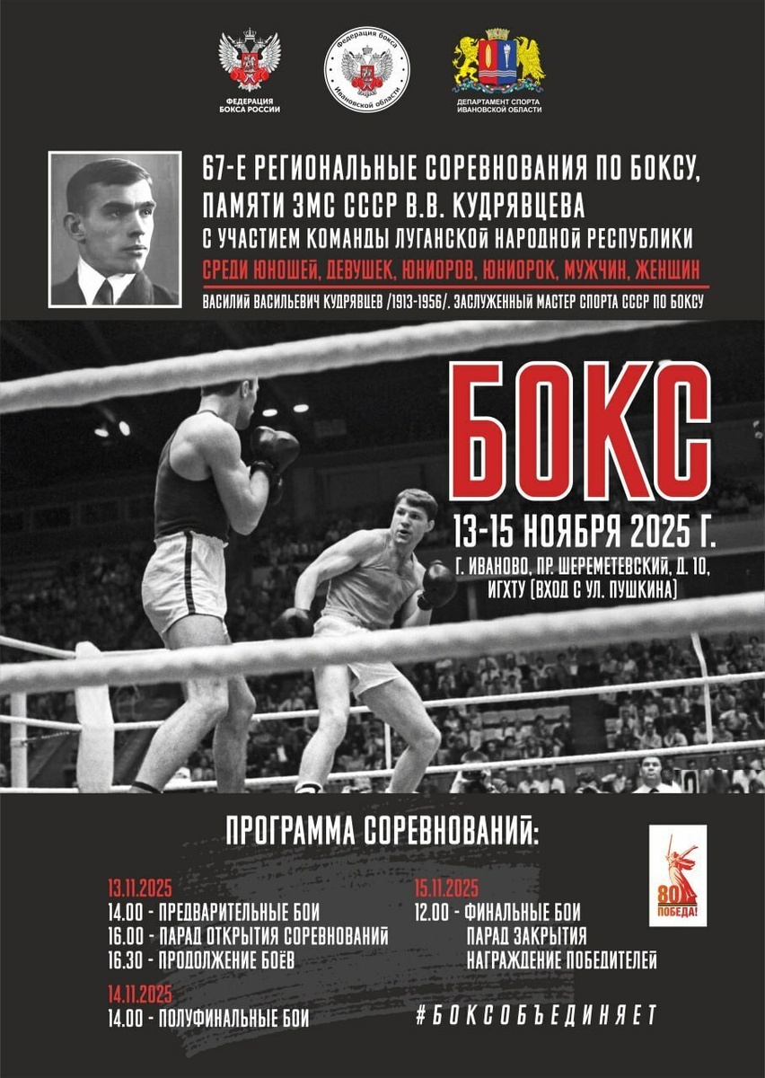 📢🔥 С 13 по 15 ноября 2025 года, в городе Иваново пройдут РЕГИОНАЛЬНЫЕ СОРЕВНОВАНИЯ ПО БОКСУ 🥊, ПАМЯТИ ЗМС СССР В.В.КУДРЯВЦЕВА с участием команды ЛУГАНСКОЙ НАРОДНОЙ РЕСПУБЛИКИ среди юношей, девушек, юниоров, юниорок, мужчин, женщин. В соревнованиях примут участие все возрастные группы👍 Всего, выступит более 1⃣0⃣0⃣ спортсменов! Победители и призёры будут награждены специальными призами от Федерации, а так же медалями и грамотами 🏆👍 ✅ Соревнования проводятся с целью развития бокса на территории 🇷🇺 Российской Федерации. 👉 Место проведения: г. Иваново, проспект Шереметевский, 10. Спортивный зал ИГХТУ (вход с ул. Пушкина). ЖДЁМ ВСЕХ поклонников бокса, спортсменов, тренеров и жителей города посетить соревнования и поддержать участников 🙌 Подробности: vk.com/wall-155617351_5338 ➡ ВХОД СВОБОДНЫЙ! 12+