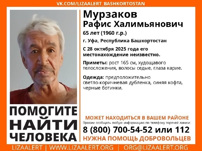 Поиски 65-летнего мужчины ведутся с 28 октября. По данным отряда «Лиза Алерт РБ», мужчина, предположительно, был одет в светло-коричневую дубленку, синюю кофту и черные ботинки. Особые приметы исчезнувшего — рост 165 см, худощавое телосложение, седые волосы, карие глаза. Это не первый случай, когда мужчина пропадает — ранее его искали в декабре 2023 года. Обращаться по телефону: 8-800-700-54-52 или 112.