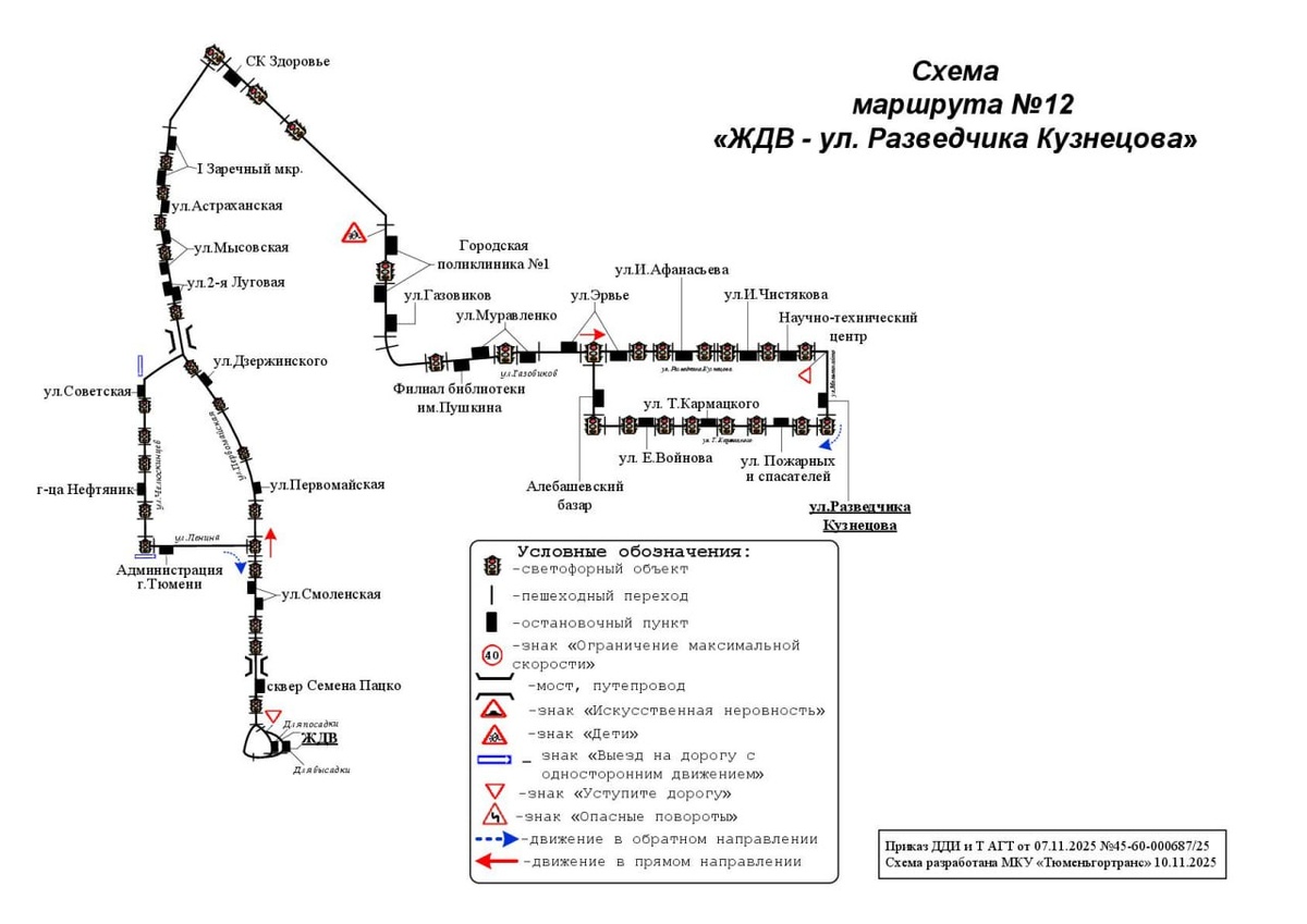 Изменения в схеме движения маршрута № 12 С 22 ноября 2025 года изменится схема движения маршрута регулярных перевозок № 12 «ЖДВ – Озеро Круглое». Из схемы движения исключаются остановочные пункты «Озеро Алебашево», «ул. Береговая», «ул. Евгения Войнова», «ул. Тимофея Кармацкого», «ул. Пожарных и спасателей», «ул. Разведчика Кузнецова» в прямом направлении, «Озеро Круглое» в прямом и обратном направлениях. Маршрут будет следовать по улице Разведчика Кузнецова в прямом направлении. В схему включаются остановочные пункты «ул. Эрвье», «ул. Ивана Афанасьева», « ул. Ивана Чистякова», «Научно-технический центр» в прямом направлении. Расписание для пассажиров общественного транспорта доступно в разделе «Расписание» на сайте tgt72.ru, в мобильном приложении «Тюмень. Транспорт», по бесплатному номеру телефона информационно-справочной службы 8-800-250-0722 и на остановках. МКУ «Тюменьгортранс»