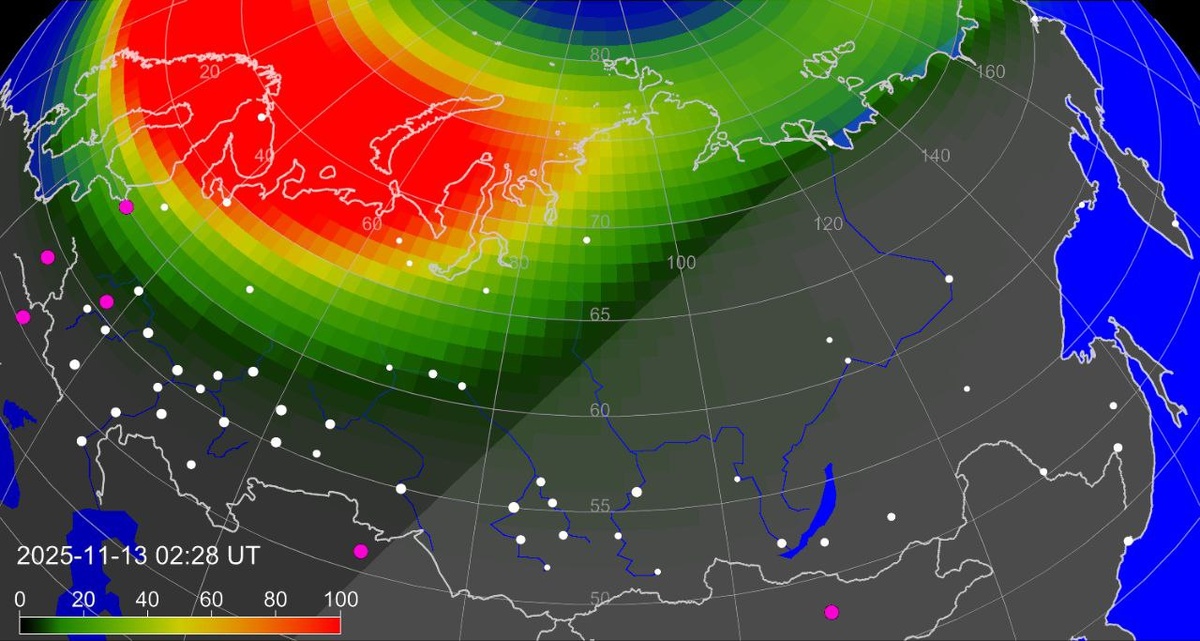 Москва, 13 ноября — ИА Время Пресс. Мощнейшая вспышка на Солнце и последующий выброс плазмы принесли на Землю самое сильное северное сияние за последние 10 лет. Об этом говорится в сообщении экспертов лаборатории солнечной астрономии ИКИ РАН. По данным астрономов, ранним утром был шанс увидеть полярное сияние, начиная с широт 45 градусов. «Полярный овал уже уходит в Европу и Канаду, но, возможно, кто-то успеет поймать хвост до восхода Солнца», — говорится в сообщении астрономов. Скриншот Лаборатории солнечной астрономии (XRAS) В комментариях подписчики пишут, что заметили красное небо над Москвой и Ленобластью, однако называть это ярким северным сиянием они бы не стали. Однако нашлись те, кто все же видели розовое небо: в районе Тункинской котловины над Байкалом, а также в Берлине и даже в Канаде. Также комментаторы сообщили, что на севере Якутии и в Красноярском крае в морозную ночь им все же удалось застать настоящее северное сияние в красно-зеленых оттенках. Жители Свердловской обла