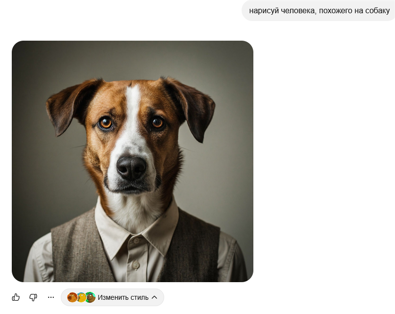 Для художника в первоначальном промпте "нарисуй человека похожего на собаку" самое главное, естественно, "человек", его он и будет рисовать. А следующее - "похожего". Не "собака" - "похожий". Знает ли Алиса смысл слова "похожий"?