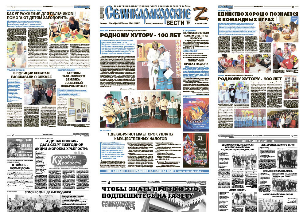 В этом году продолжается возведение жилья в Семикаракорском районе; Активисты партии ЕР соберут игрушки для маленьких пациентов больниц области акция носит название «Коробка храбрости»; страница «Спортивная арена» расскажет о достижениях семикаракорцев в спорте;