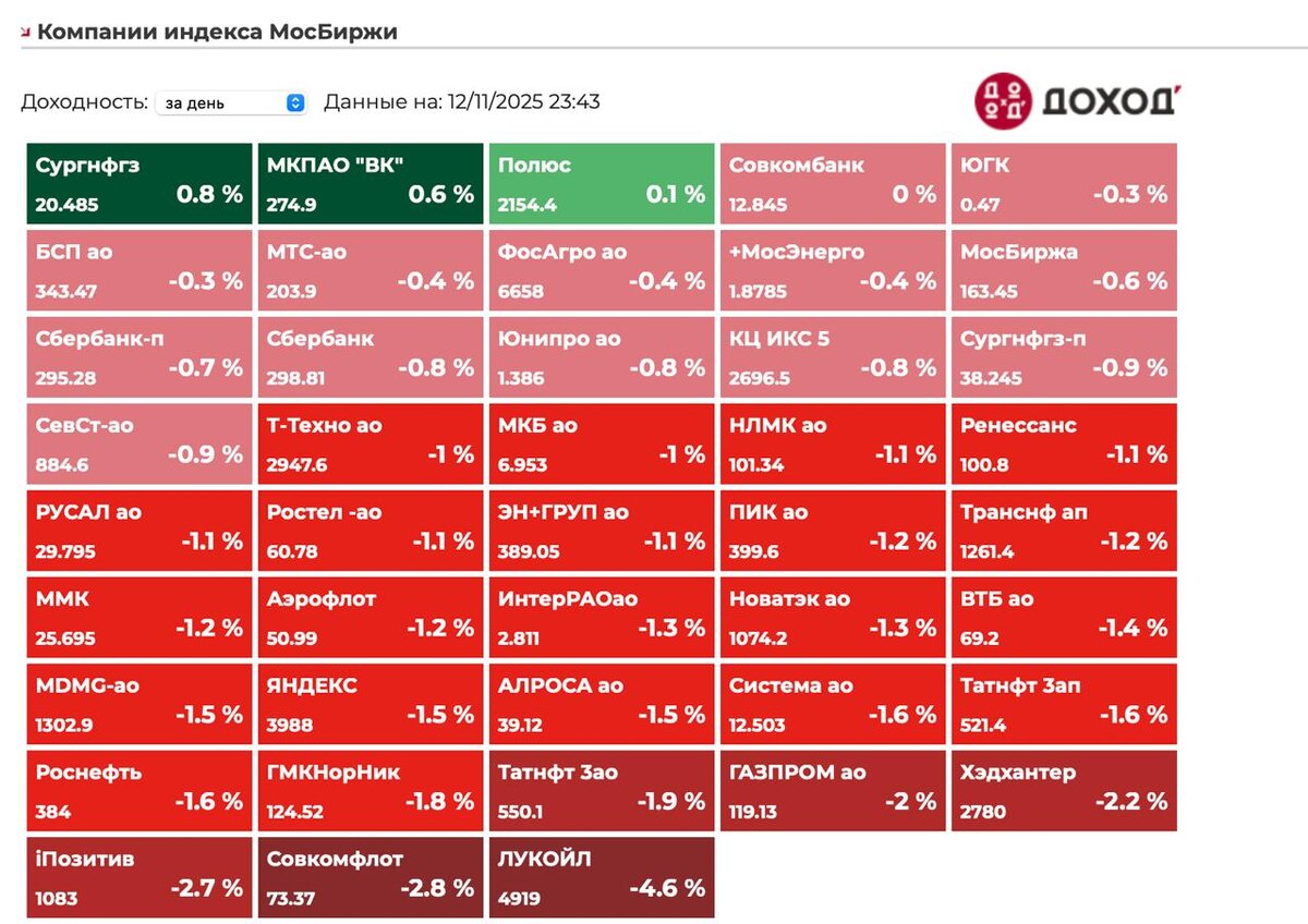 РФ рынок: что нас ждет сегодня В среду индекс мосбиржи упал на 1,5% до 2538 пунктов. Юань вырос на 0,25% до 11,367. Нефть упала на 3,5% до $62,5. ОФЗ: теперь и в юанях На 3 миллиарда евро будет погашени 3 декабря. Теперь же займут и в юане на 3 года Это небольшие для бюджета объемы. Вчера, привлекли 1,86 триллиона рублей в ОФЗ - вот что флоатеры делают! В октябре привлекли 900 миллиардов рублей. Так что план в 3,8 триллиона выглядит не страшно, осталось за полтора месяца привлечь 1,1 триллиона и большая часть похоже флоутеры. Позитив для цен на длинных ОФЗ, меньше будет навеса и шортистов в стакане, проще акциям будет расти. Бензин: теперь падаем Инфляция составила 0,09% за последние 5 дней. В годовом выражении инфляция составила 7,73% vs 7,9% на прошлой неделе. Цены на огурец выросли на 6%, а бензин упал на 0,18% впервые за полтора года. Уверенно идем на 6,5% инфляции по итогам 2025. Украина: переговоры Шредингера Вчера сообщили о том что переговоры с Россией остановились, сег