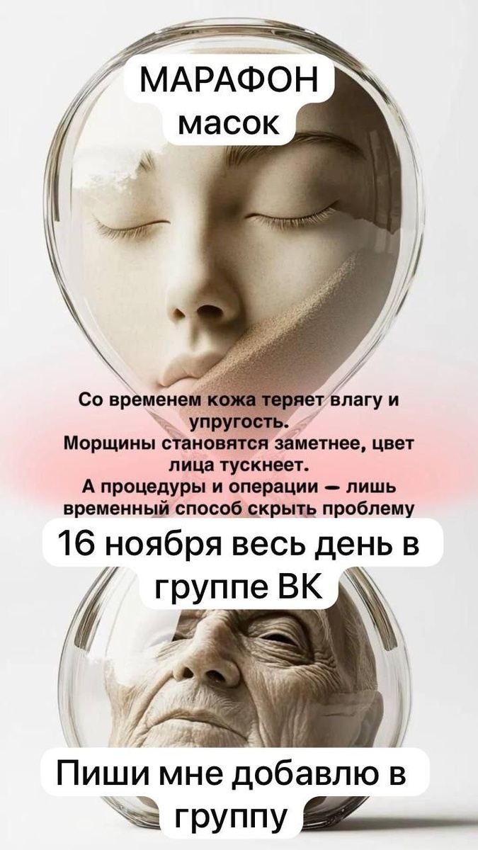 Приглашаем на Бьюти-марафон «Сияние кожи»! Дорогая, Приглашаем вас принять участие в захватывающем онлайн-марафоне «Сияние кожи»! Этот мастер-класс по уходу за лицом не выходя из дома поможет вам освоить навыки здорового образа жизни и правильного ухода за собой. Что вас ждет: Научитесь правильно подбирать и наносить различные маски Поймете потребности своей кожи и создадите личную систему ухода Получите ухоженную, сияющую кожу уже через несколько дней! Работают только профессионалы и качественные продукты! Когда: 16.11.25 Где: Онлайн ВК Стоимость: Бесплатно Для участия просто напишите https://vk.com/wagneranna Будем рады видеть вас среди участниц! С наилучшими пожеланиями❤️