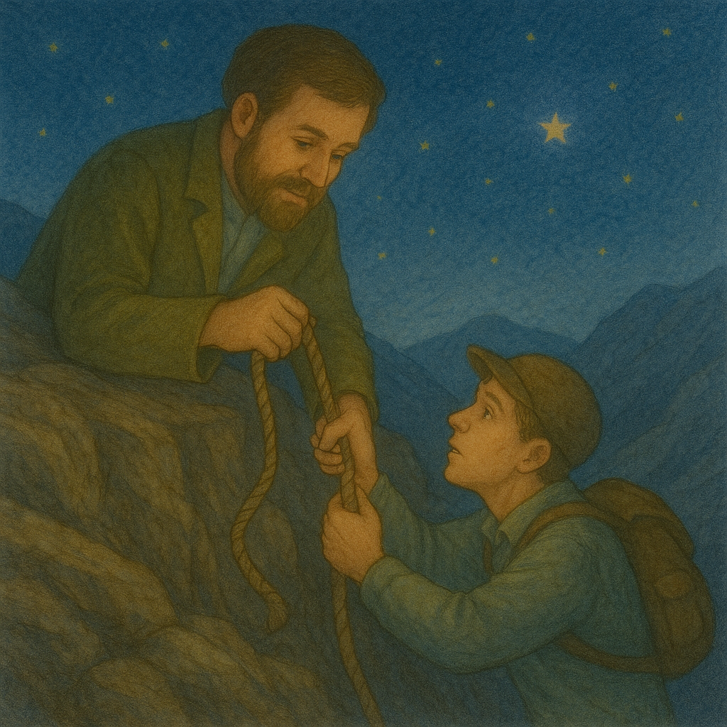 Ребята закричали, бросились к обрыву. Парень зацепился за камень, но выбраться сам не мог. Все растерялись, только Василий Павлович остался спокоен. Он спустился чуть ниже, протянул верёвку и сказал тихо, будто продолжая разговор: - Не бойся. Главное не смотреть вниз. Смотри вверх. На свет. Он выведет. Студента вытащили, он не пострадал. Потом, когда лагерь успокоился, кто-то спросил: - Василий Павлович, вы совсем не испугались? Он улыбнулся: - Страх бывает, когда темно. А у меня есть моя звезда. Иногда, когда костёр гас, он тихо говорил студентам: «Когда вам пло