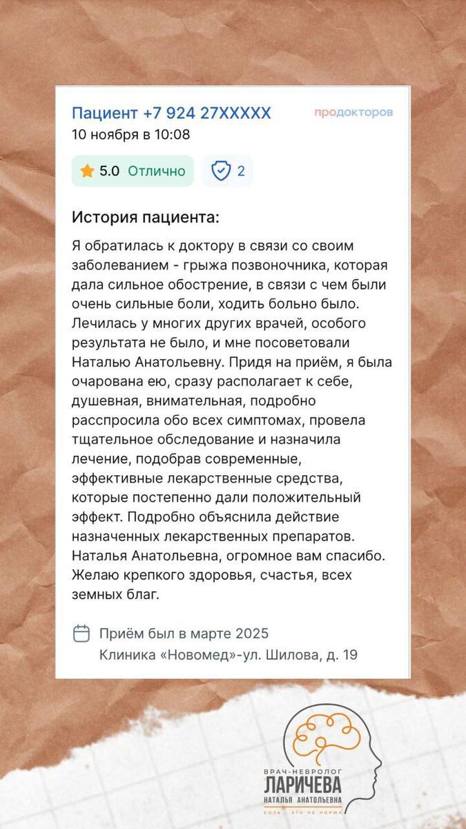 Дорогие пациенты! 🧡 Хочу выразить искреннюю благодарность за ваши отзывы! Ваши слова вдохновляют и помогают становиться лучше. Спасибо, что доверяете своё здоровье 🧡 С уважением, теплом и заботой, Ларичева Н.А.
