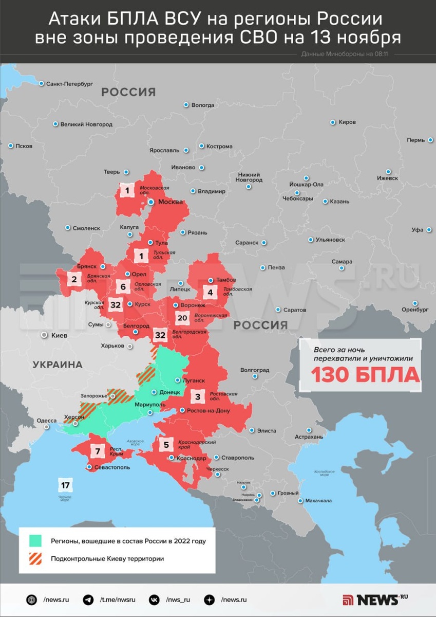 130 украинских БПЛА уничтожили над Россией за ночь, сообщили в Минобороны. По 32 дрона сбили в Курской и Белгородской областях, 20 — в Воронежской, 17 — над акваторией Черного моря. Где еще ликвидировали украинские беспилотники — смотрите в нашей инфографике. ⭕️ Подписаться | Мы в MAX | Буст