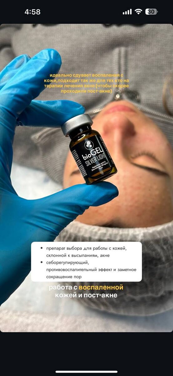 BioGel SILVER LIGHT - препарат обладает мощным противовоспалительным действием, эффективен для сужения пор и нормализации уровня выработки себума 🌿 Это препарат для пациентов, склонных к образованию воспалительных процессов и акне в анамнезе ☝🏻 ПОКАЗАНИЯ К ПРИМЕНЕНИЮ: ➖ Себорегуляция ➖ Сужение пор ➖ Противовоспалительный эффект ➖ Выравнивание тона у пациентов с жирной кожей ➖ Уплотнение кожи для пациентов старшей возрастной группы ДЕЙСТВУЮЩИЕ ВЕЩЕСТВА: 🧪 Хлорид цинка 20 мг/мл Цинк обладает противоспалительным действием, стимулирует работу фибробластов, участвует в клеточном метаболизме 🧪 Гиалуроновая кислота 1% Увлажнение и питание кожи на глубоком уровне 🧪 Аминокислоты: ▪︎ Глутатион ▪︎ Гидроксипролин ▪︎ Лизин ▪︎ Валин ▪︎ Глицин Области применения: лицо, шея, декольте, руки, тело.