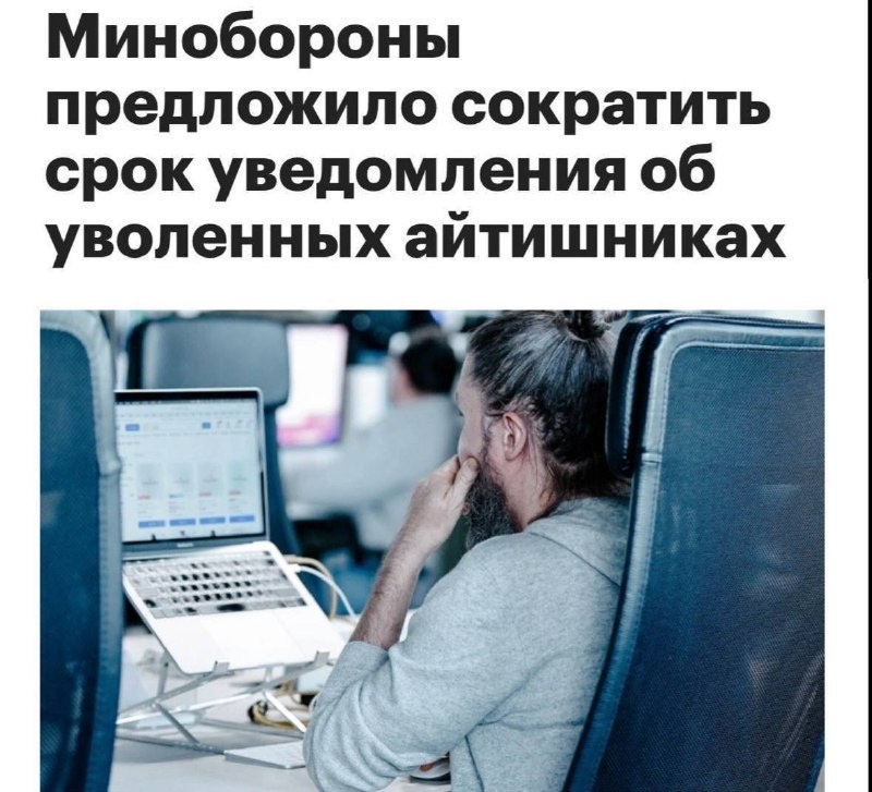 Минобороны собирается ужать срок уведомления об увольнении айтишников с 14 до 5 дней — об этом пишут СМИ. По новой схеме аккредитованные ИТ-компании должны будут передавать данные в военкомат не позже чем через пять дней после увольнения сотрудника с отсрочкой. • Потерял работу — на поиск нового места почти не остаётся времени. • Любая задержка между компаниями становится риском: без свежего трудового договора отсрочка слетает автоматически. • Работодателям тоже закрутят гайки — прокатывать забытые уведомления больше не выйдет. • Система станет заметно жёстче и куда прозрачнее. Пока это только инициатива, но настроение у процесса понятное. 🤷♂️... Подробнее: https://hard-tm.su/threads/127320/ 🕹HARD-TM — Подписаться